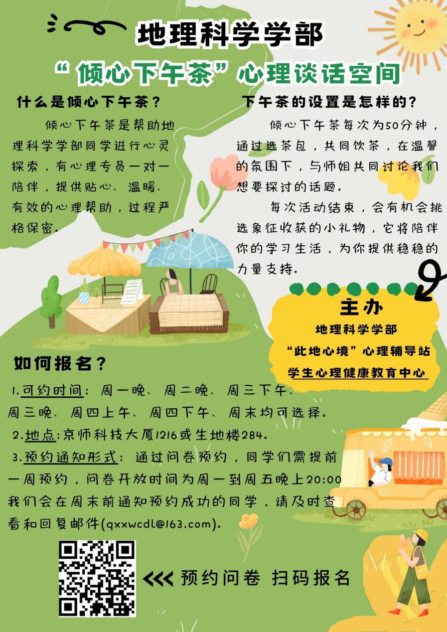 “此地心境”是老司机论坛 二级心理辅导站,位于生地楼148、京师科技大厦B座1216学生生活指导室,配备有专业的心理专员,联合辅导员、心理健康教育中心,形成专兼结合的服务队伍,开展心理健康教育宣传、心理疏导等工作。目前“此地心境”下设“倾心下午茶”一对一谈话、“暖心你我他”宿舍箱庭团辅、“齐心共偕行”班级团辅活动、“随心寄夜话”线上心理科普四类活动。
