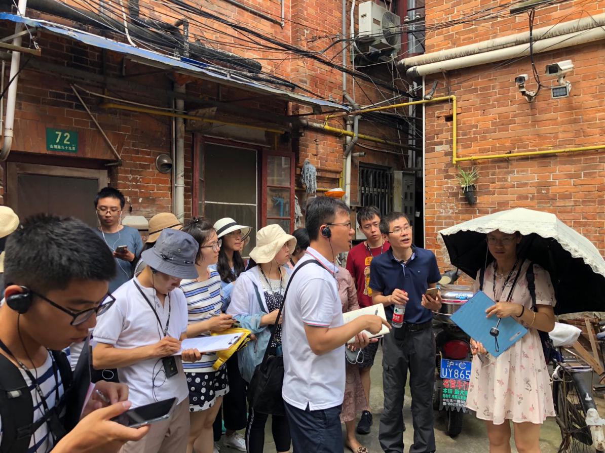 同济大学建筑与城市规划学院的陆希刚老师在新康里小区给学生们讲解