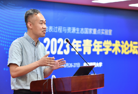 6月26日上午,地表国重实验室主任效存德教授致开场词。效老师对参加论坛的各位老师和同学表示热烈欢迎,希望大家能够在论坛上积极交流、碰撞思想、迸发灵感。特邀报告环节,翟盘茂研究员、潘成忠教授、余新晓教授、董金玮研究员分别作了题为“气候变化对极端天气气候事件的影响”“植被-土壤侵蚀动力学过程”“森林水库—森林植被与水资源协同调控”“农业土地利用变化的遥感监测与环境效应”的报告。报告引发了在座师生对极端天气气候事件、山坡水文侵蚀等问题的热烈交流和思考。