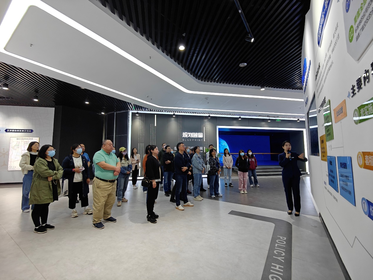 一行人首先来到了临空区综合展示中心,参观了临空经济区建设背景、区位概况、规划体系等版块内容,观看了《临空印象》微视频。通过先进的影像技术进行了沉浸式学习,深切感受了临空故事,领略临空印象,见证临空辉煌。近年来,临空区深入贯彻落实京津冀协同发展战略,发挥北京大兴国际机场国家发展新动力源的辐射作用,立足新发展阶段,践行新发展理念,构建新发展格局,在生态、产业、交通等方面深度融合,创建共建共管共享模式,打造京津冀协同发展的高水平对外开放平台。世界向东,北京向南,风生水起看大兴,生机勃发在临空。