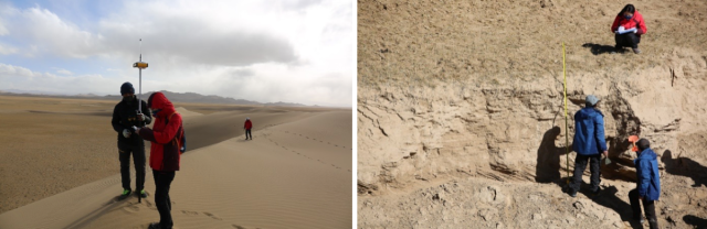 沙丘断面测量(海拔4120米) 沙丘剖面采样(海拔4350米)