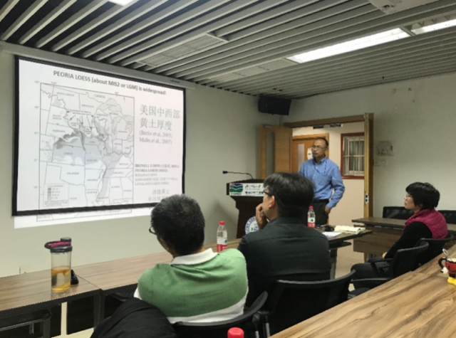 苗晓东教授介绍了美国中部大平原半干旱区半湿润区的风成黄土的目前研究现状,并指出与中国北方地层连续而且巨厚的黄土相比,美国中部大平原的黄土主要沉积为晚更新世PEORIA黄土(MIS2),分布也不连续。通过对伊利诺伊州黄土的OSL年代测定,证实了美国密苏里河以东全新世黄土的存在,并且为黄土埋藏的古文化层的解释提供了新的思路。