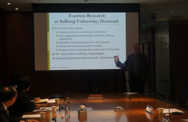宋长青部长首先代表学部,对奥尔堡大学来访表示了欢迎,他接着提到,奥尔堡大学“以问题为导向、由项目来组织”的PBL教学模式广受赞誉,双方教学科研上有多种合作的可能与机会。奥尔堡大学设有旅游学研究中心,Halkier教授本人在旅游学研究上颇有建树,会上他介绍了奥尔堡大学人文学部在旅游学教育、科研上的基本情况。随后,宋金平教授也介绍了中国旅游实践的几个转变,以及学部旅游学研究的主要进展。通过会谈,双方在师生互访、课程共建、博士生联合培养等方面达成了初步合作意向。 交流会后, Halkier教授先后做了两场学术报告,题目分别为 “Tourism Policy in Denmark: Multi-level governance in transition”和“Food, tourism and Rural Development: Comparing Denmark and England”。地理学部近20名师生与Halkier教授进行了现场交流与讨论。