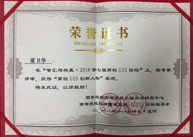 在本次论坛上,评审专家组按照公开、公平、公正的评选原则,严格参照评审规则,经资格审查、评审专家组讨论、打分、投票等评选程序,共评选出“高校GIS创新人物”10人,老司机论坛 董卫华教授获此殊荣。