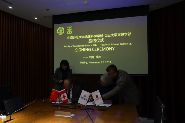 2018年11月22日,加拿大女王大学文理学部部长Barbara Crow教授,创新中心执行主任Greg Bavington博士,发展与合作办公室负责校友关系与捐赠事务的副主任Elizabeth Gorman女士、职员Maryanne Wainman女士,以及加拿大女王大学中国代表处主任张志尧博士等一行5人访问学部并与我方共同举办联合野外实习项目签约仪式。宋长青执行部长代表学部欢迎并会见来宾,朱华晟副部长主持签约仪式,双方顺利签订协议,同时就相关合作事宜进行了会谈交流,参与交流的还有地理学院程杨副教授,学部教务秘书刘静,外事秘书章文娟和苗琼月。
