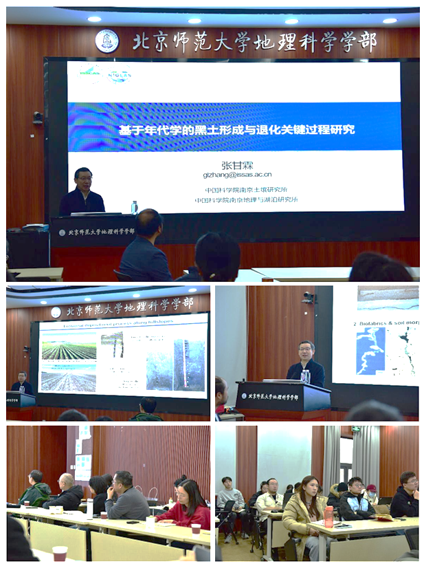 12月16日上午,学术月终场报告在生地楼180会议室举行。中国科学院南京土壤研究所张甘霖研究员作 “基于年代学的黑土形成与退化关键过程研究”学术报告。本次报告会由张卓栋教授主持,来自学部及北京大学等单位的六十余名教师及学生参会。此次报告,张甘霖研究员介绍了其团队解决了传统测年受土壤扰动影响的局限,明确了我国东北黑土的形成时间、驱动机制与退化风险,为黑土保护与修复提供了理论支撑。团队应用单颗粒释光测年等多项技术,结合统计模型量化土壤扰动强度,并利用黑土层底界的木炭标定黑土年龄上限,破解了黑土年龄之谜。团队提出加积成土模型,揭示黑土是粉尘持续堆积、有机质累积与生物扰动等共同作用的结果。报告强调,由农业生产等人类活动造成的土壤侵蚀速率已超过自然成土速率,应该对珍贵的黑土资源进行有效保护。这些发现不仅完善了全球黑土成土理论,更明确了分区保护、尽可能降低人为扰动等核心问题,为黑土可持续利用、守护粮仓根基提供了关键科学依据。