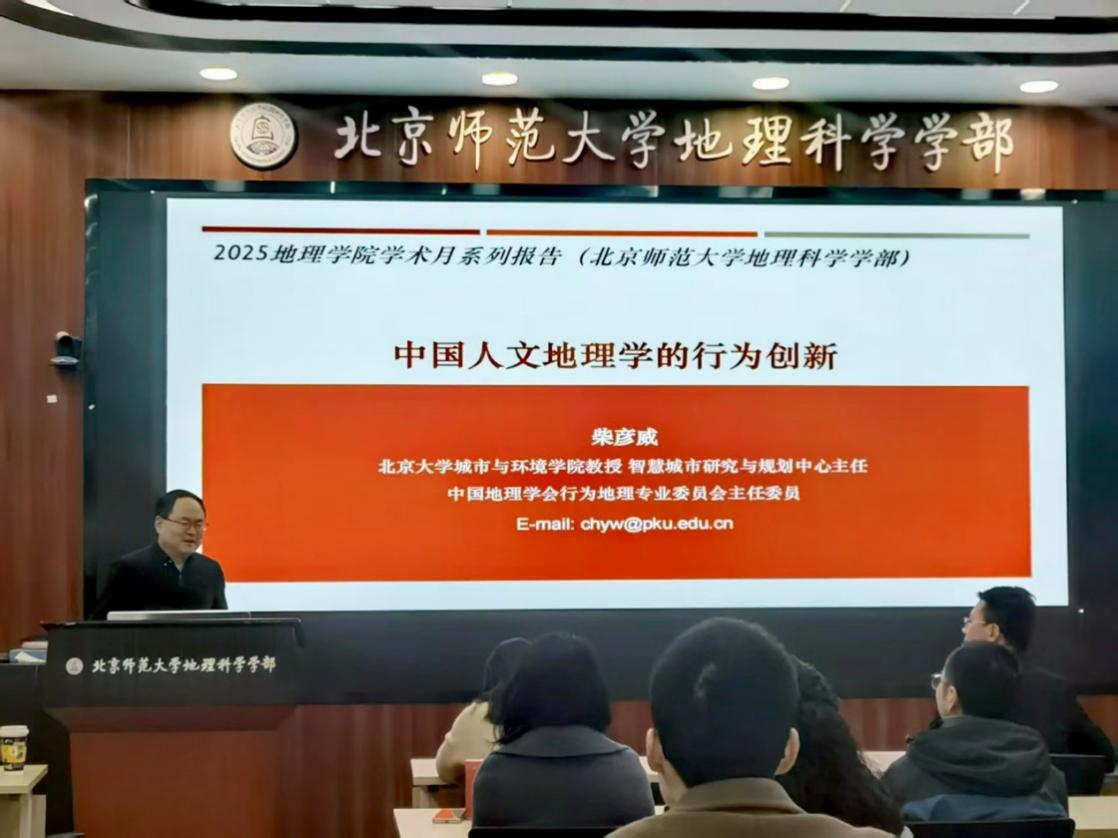 12月2日上午,第四场报告在生地楼180会议室举行。北京大学柴彦威教授围绕“中国人文地理学的行为创新”展开学术分享。马静教授主持报告会,程杨教授致辞,二十余位师生参与交流。柴彦威教授梳理了人文地理学的发展脉络与东西方差异,系统阐述了行为地理学在理论、方法与应用层面的创新。他指出,中国人文地理学经历了从“计量革命”到“行为革命”的转型,行为主义地理学、时间地理学与移动性地理学共同构成其理论支柱。在此基础上,他提出“主客观交互、长短期交互、多主体交互”的时空间行为交互理论,并强调未来应加强学科交叉、深化时空整合、创新研究方法,以响应国家在精细化治理、城市安全与流动性管理等领域的战略需求。