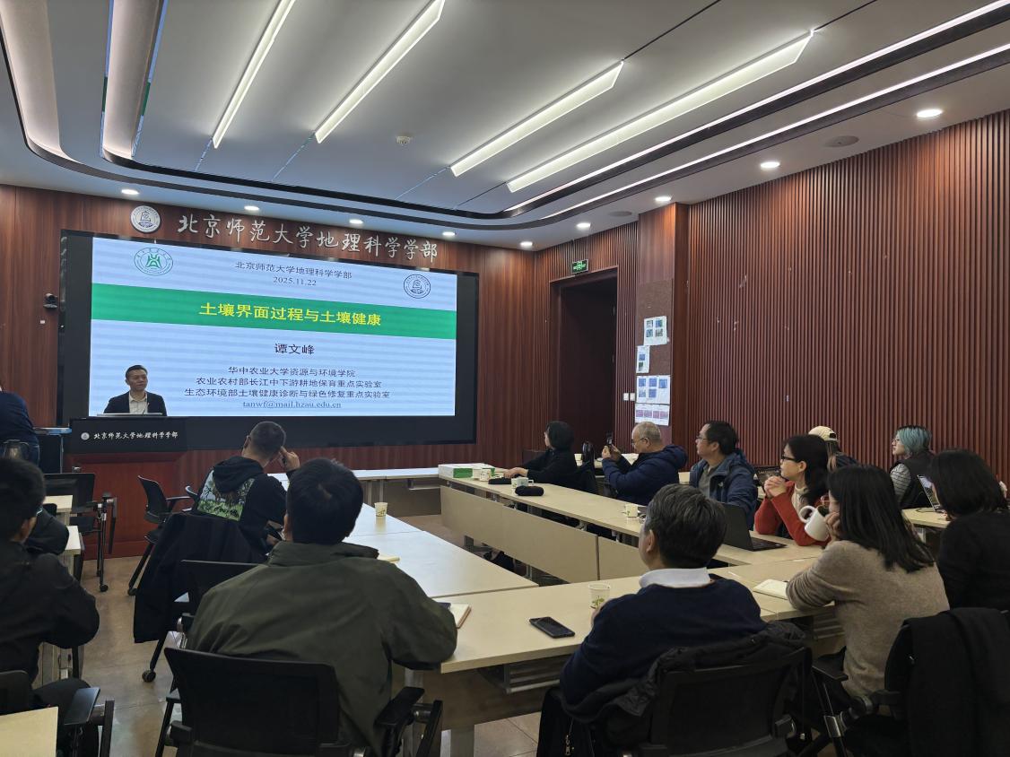 11月22日下午,学术月第三场报告在生地楼180会议室举行。报告邀请华中农业大学谭文峰教授,以“土壤界面过程与土壤健康”为题进行分享。符素华教授主持本次活动,学部教师、研究生等三十余人参与交流。谭文峰教授从土壤健康的基本概念出发,系统阐释了土壤重金属形态与界面反应、团聚体形成过程与胶结机制,以及土壤健康的生态调控技术。他强调,土壤矿物—有机物—微生物间的界面过程是理解土壤健康机制的核心,并指出土壤健康不仅关乎农业生产,更关系到生物多样性保护与环境功能提升。报告深入浅出,引发了在场师生的热烈讨论。