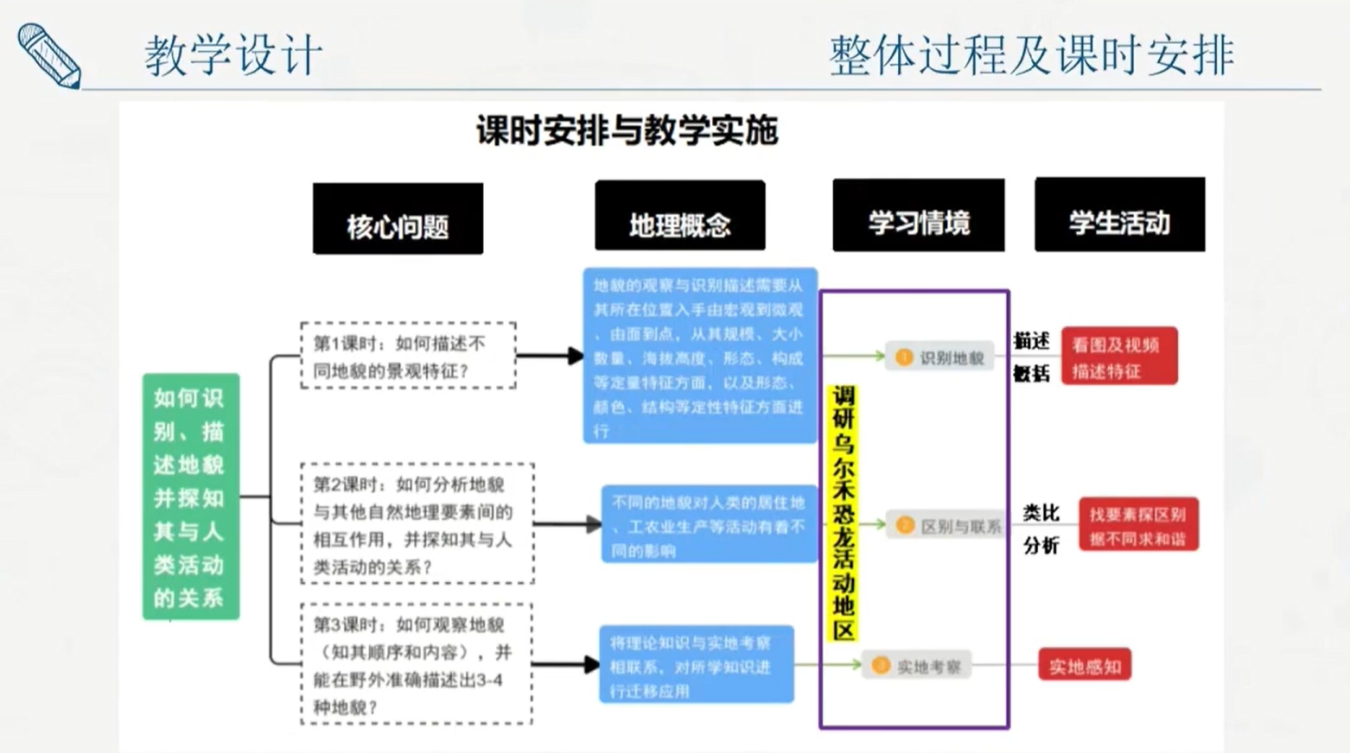 接着张晓嵘教师从主题背景、学习目标、教学设计、以及作业设计和评价四个方面展开了主题为“追随恐龙足迹探究形成‘魔鬼城’的地貌类型”的说课。单元以地貌与人类活动为主线,以西北地区的风沙地貌为案例,按照“情景感知-分类识别-特征描述-共同构建”的思路展开。在教学整体设计中,从“如何识别、描述地貌并探知其与人类活动的关系”的核心问题展开,拆解出不同课时的核心问题,引出相关的地理概念,结合学习情景,展开学生活动。说课结束后张爱弟教研员进行了单元设计点评,分析了该案例的特色与亮点:一是探究式主题、隐含大概念主线,构思新颖;二是围绕大概念和核心素养进行了单元内容的重构;三是学习活动设计基于真实情境,贯穿素养培养;四是单元教学目标有层次;五是单元评价与单元学习目标呼应,体现整体性,开放性和主体性。最后张教研员提出了将大概念体系与单元课时设计的有机结合、概念体系和问题体系的梳理、单元大情景设计的具体化、过程性评价的完整性等几个方面的改进建议。