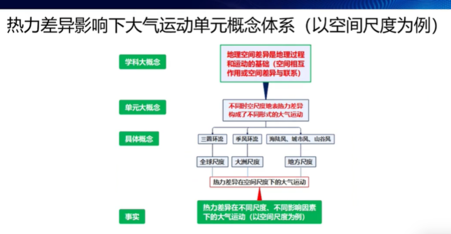 张爽教师从单元背景分析、单元学习目标设计、单元教学过程设计、单元作业和教学评价设计以及单元教学反思五个方面展开了主题为“从热力学差异视角看大气运动”的说课。他以“如何利用热气球进行环球旅行”这一情景创设作为单元驱动的总问题,设计了从热量产生的原因,到地表热力差异,再到地表热力差异造成不同尺度的大气运动的层层递进的大气运动单元的知识体系;同时对热力差异影响下的大气运动单元进行了概念体系的建设,从“热力差异在不同尺度、不同印象因素下的大气运动”的事实出发,引出“三圈环流、季风环流、海陆风、城市风、山谷风”等具体概念、再到“不同时空尺度地表热力差异构成了不同形式的大气运动”的单元大概念,上位到“地理空间差异是地理过程和运动的基础”的学科大概念。说课结束后张素娟教授进行了题为“从课时走向真正意义上的单元”的专家点评,她总结了该案例的4个总体优点:一是单元特征和单元设计的意义明确,指向学生的地理核心素养;二是单元重构的意识凸显,统整线索明朗;三是情景下任务驱动的多元互动参与方式;四是形成了相对完整的单元知识建构和大概念的深层理解。最后张教授为该案例提出了大概念在单元学习目标中的体现、以单元为单位的评价和作业整合设计、以及单元学习目标的整合优化设计等几点建议。