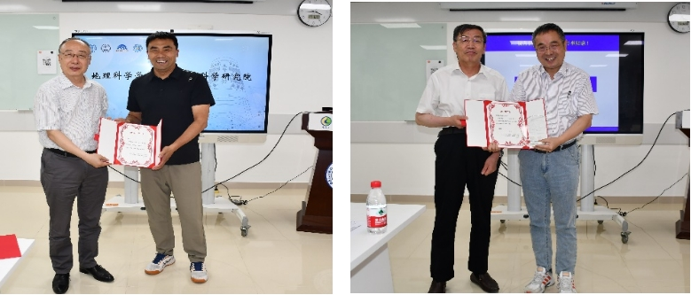 第二个环节是新入职教师及退休教师发言。石春明副教授等新入职教师介绍了个人工作、教学、研究、设想和主要目标。延晓冬教授发表退休感言,回顾了自己从教历程并分享了工作与人事感悟。随后,宋长青部长为石春明等颁发入职荣誉证书,史培军教授为延晓冬颁发荣休证书。