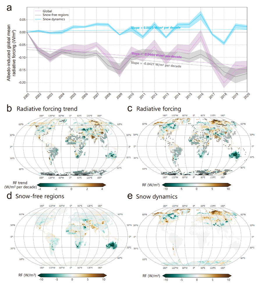 图2. 2001-2020年陆表反照率变化产生的辐射强迫。(a) 全球平均、全球无雪区和雪动态所引起的辐射强迫的年际变化。虚线表示采用Theil-Sen中值法作为稳健统计方法的线性拟合,阴影区显示了6个辐射核计算结果的最大和最小值。(b) 2001-2020年间由全球陆表反照率引起的辐射强迫变化趋势的空间分布。(c) 从200-2020年由反照率引起的辐射强迫变化的空间分布。黑点表示两个独立时间窗口(2001-2010年和2011-2020年)之间辐射强迫变化具有统计显著性的区间。(d)-(e) 从2001-2020年归因于无雪区(d)和雪动态(e)的辐射强迫的空间分布。