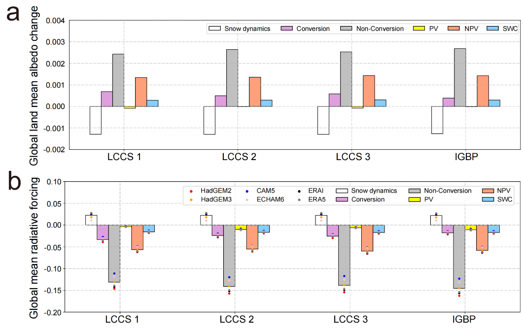 图3. 反照率变化及其引起的辐射强迫。(a) 在四种LULC分类方案下,由不同因素引起的全球陆表平均反照率变化。(b) 由反照率变化引起的全球平均辐射强迫。其中,白色、紫色和灰色柱状图分别表示由冰雪动态变化、LULC变化以及LULC未变化区域引起的反照率变化;绿色、橙色和蓝色柱状图分别表示光合植被(PV)、非光合植被(NPV)和地表含水量(SWC)的个体贡献。图(b) 中的圆点表示基于六种不同辐射核计算的全球平均辐射强迫值。