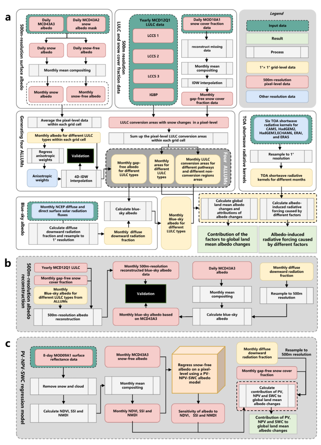 图1. 研究框架流程图。a. 构建ALLUMs,并计算LULC变化对全球陆表平均反照率变化及引发的辐射强迫的贡献。b. 验证重建的 500 米分辨率晴空反照率。c. LULC未变化区域内光合植被(PV)、非光合植被(NPV)和地表含水量(SWC)对陆表反照率变化的贡献。粉色和黄色方框中的数据分别代表 500 米分辨率的像元和网格尺度上的数据。