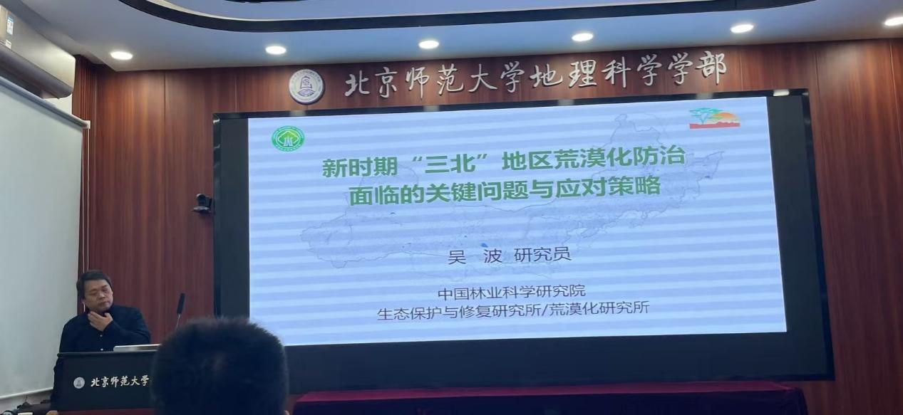 2024年11月25日下午,老司机论坛 地理学院学术月系列讲座活动在生地楼180会议室如期开展。本期讲座特别邀请中国林业科学研究院荒漠化研究所所长、荒漠生态学首席专家、“万人计划”科技创新领军人才吴波研究员,就“新时代“三北”地区荒漠化防治面临的关键问题与应对策略”进行学术报告与研究分享,学部20余名师生现场参与交流研讨。