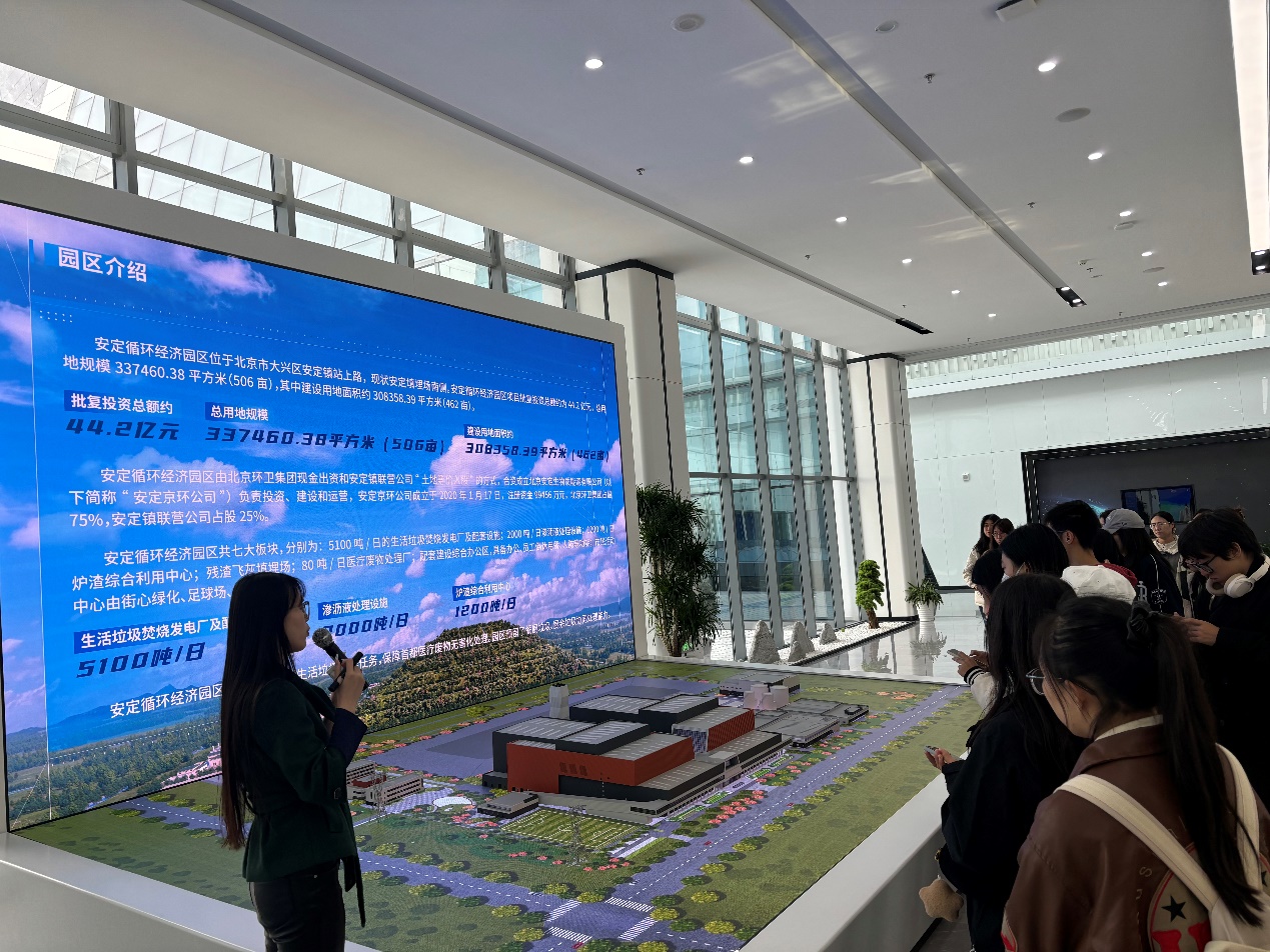 参观活动的第二站是安定循环经济园。作为北京市乃至全国领先的循环经济示范项目,安定循环经济园先进的垃圾处理技术和运营管理模式对提升公众环保意识、推动绿色发展具有重要意义。师生们在园区负责人的带领下,首先观看了园区的宣传片,了解了园区的基本情况、发展历程以及取得的成就。随后,一行人参观了生活垃圾焚烧发电厂、渗滤液处理站、炉渣综合利用厂以及医疗废物处理厂等核心设施。这些设施的先进技术和高效运营让师生们深刻感受到了循环经济在资源节约和环境保护方面的巨大潜力。