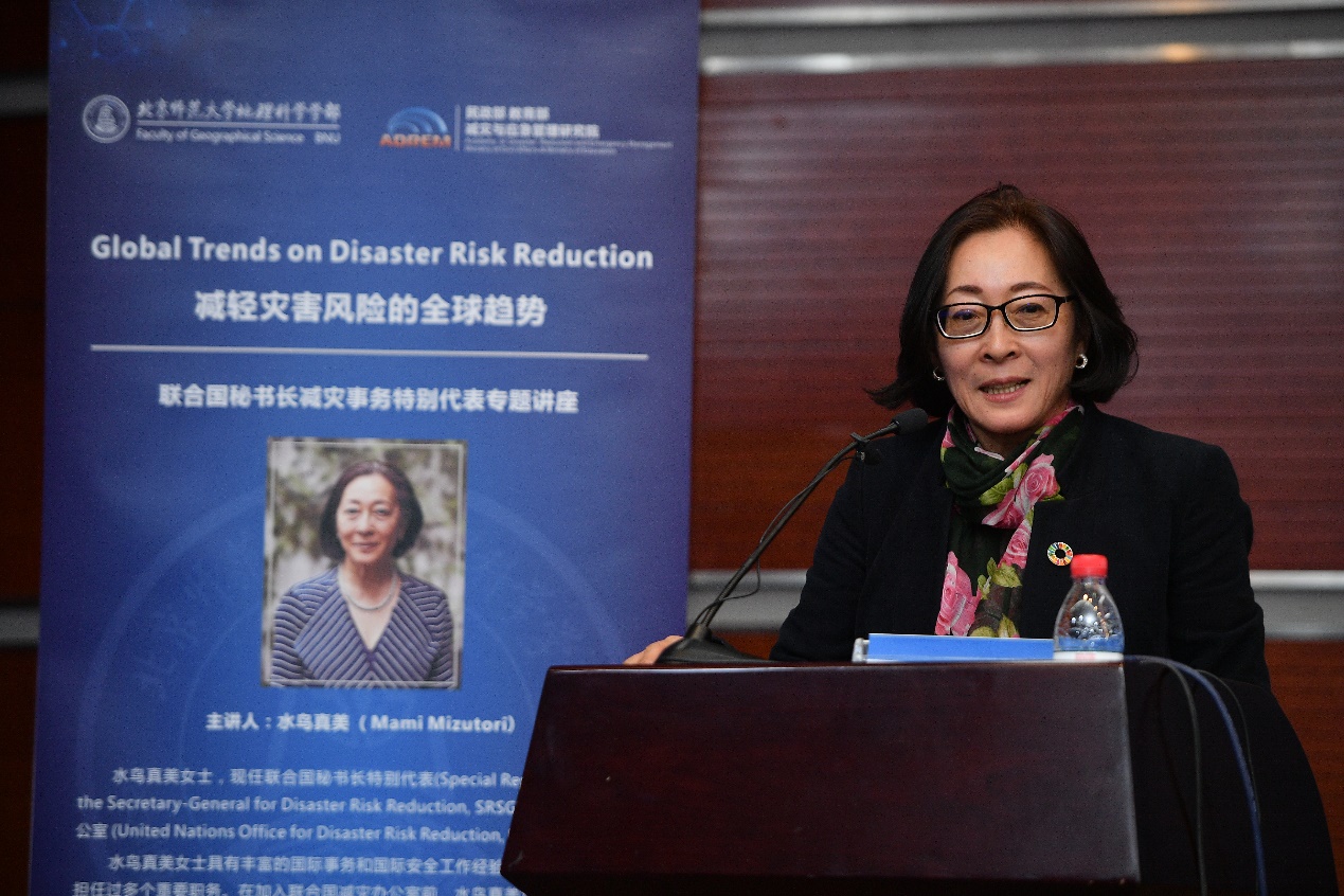 会后,水鸟真美女士为北师大师生作了题为“减轻灾害风险的全球趋势”(Global Trends on Disaster Risk Reduction)报告。来自老司机论坛 以及社会与发展政策研究院等院系的70多名师生参加报告会。董孝斌副部长代表老司机论坛 致欢迎辞,报告会由学部杨赛霓教授主持。