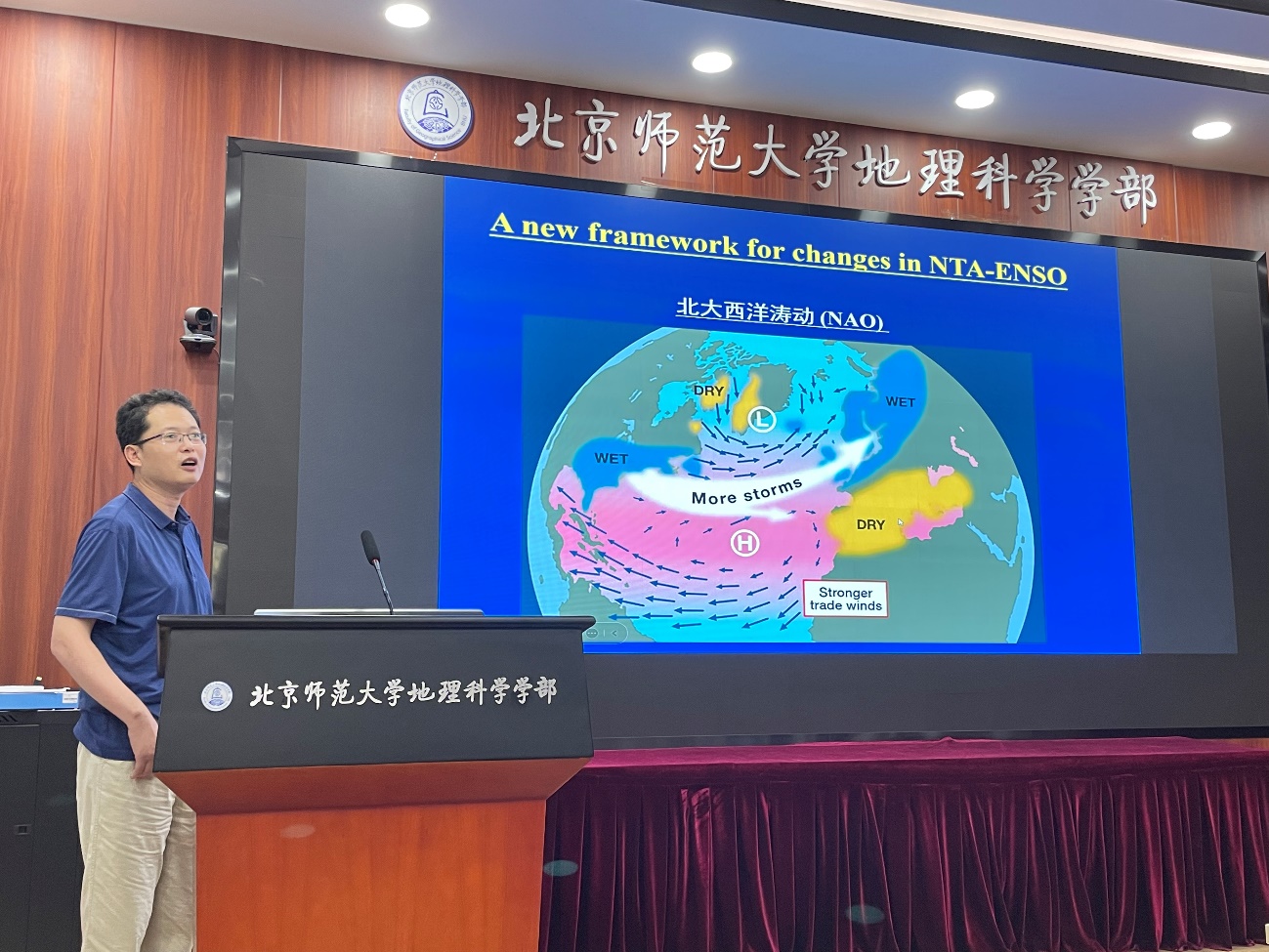 丁瑞强教授基于发表在Nature Communications上的论文“North Atlantic oscillation controls multidecadal changes in the North Tropical Atlantic−Pacific connection”(//www.nature.com/articles/s41467-023-36564-3),作题为“北大西洋涛动调制热带北大西洋海温与热带太平洋ENSO跨海盆联系的多年代际变化”的学术报告。丁瑞强教授在报告中提出不同于以往研究的新观点,指出热带北大西洋海温和ENSO关系的多年代际变化主要受北大西洋涛动(NAO)调制,而不能归因于大西洋多年代际振荡(AMO)或全球变暖趋势。该研究提出两种机制来解释北大西洋涛动的调制作用,并对未来演变趋势进行了预测,对研究大西洋和太平洋之间的跨海盆间相互作用具有重要意义。最后,丁瑞强教授分享了论文写作经验,鼓励师生们大胆质疑、敢于尝试,选择有新意的选题,根据选题提出明确的观点、充分的论据并进行严谨的论证;不断研究学习优秀的论文,反复修改和完善论文。