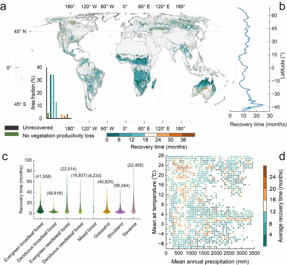 图1 火灾后植被生产力平均恢复速率的空间分布格局(a)及其在纬度梯度(b)、不同植被类型(c)和水热梯度(d)的分布。