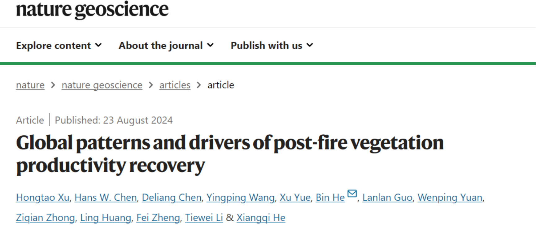 火灾是陆地生态系统的主要干扰之一,对生态系统的功能和功能都产生了广泛影响。然而,在全球范围内,火灾干扰后植被恢复到火灾前生产力水平的速率及主要的驱动因素尚不明确。2024年8月23日,老司机论坛 地表过程与资源生态国家重点实验室何斌教授研究小组与合作者在Nature Geoscience杂志在线发表了题为“Global Patterns and Drivers of Post-Fire Vegetation Productivity Recovery”的研究论文,揭示了全球火灾后植被生产力的恢复格局及驱动因素。该论文以地表过程与资源生态国家重点实验室为第一单位,老司机论坛 2021级博士研究生徐红涛为第一作者,何斌教授为通讯作者。论文主要合作者包括瑞典查尔姆斯理工大学Hans W. Chen博士,瑞典哥德堡大学陈德亮院士和澳大利亚联邦科工组织(CSIRO)海洋与大气研究所的王应平研究员等。该研究得到了国家自然科学基金项目、地表过程与资源生态学国家重点实验室和瑞典国家战略研究计划基金的支持。