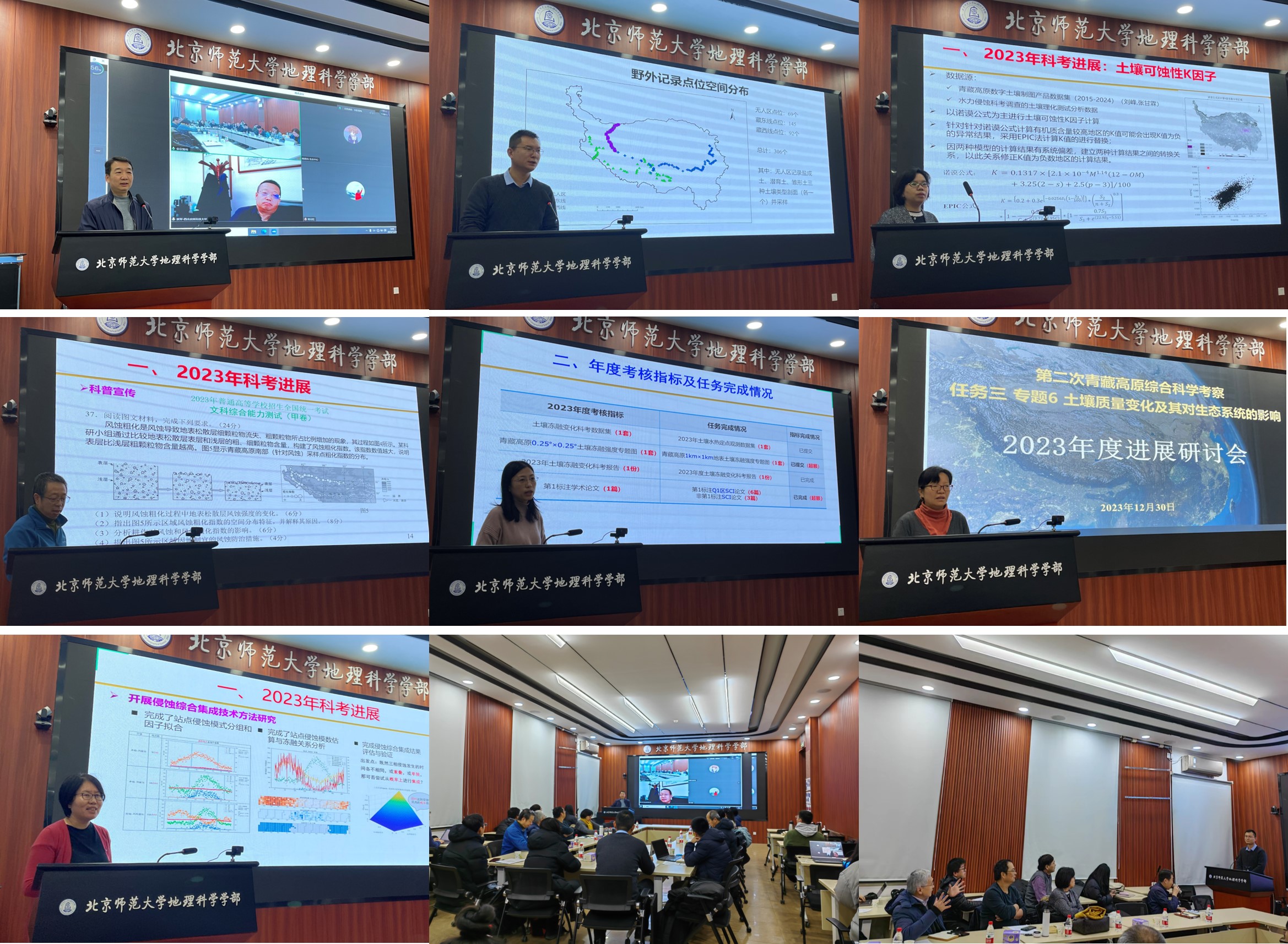 中国科学院南京土壤研究所宋效东研究员介绍了子专题1进展,2023年在完成土纲级别制图的基础上,开展了“藏东线”和“藏西线”的野外考察,评估了青藏高原土壤类型图的绘制精度。同时,介绍了在羌塘高原无人区采样中新发现的“火山渣寒冻正常新成土”“草毡红色正常新成土”以及5000米以上的潜育土,此新发现将有助于填补青藏高原现存土壤类型图的空白。2024年计划完成青藏高原土壤类型图土纲级别的完全修正,亚类级别的土壤类型制图以及土壤图不确定性分析报告。老司机论坛 符素华教授介绍了子专题2土壤水蚀考察和径流小区数据观测情况、青藏高原土壤侵蚀现状及其时空变化、水蚀对土壤肥力和土壤质地的影响;2024年,将完成土壤水蚀图集的制作和提交,该研究成果将为青藏高原水土资源保持提供数据支撑。浙江师范大学伍永秋教授介绍了子专题3进展,修正了现存土壤风蚀模型,绘制了2000-2020年青藏高原土壤风蚀强度图,评估了近40年青藏高原风蚀区以及典型风蚀区柴达木盆地的土壤质量变化,其研究结果可为土壤侵蚀与防治咨询报告提供资料支撑。老司机论坛 柴琳娜副教授介绍了子专题4在“样点-景观-区域”多个尺度取得的进展,揭示了土壤水热变化与生态系统碳源/汇变化之间的潜在联系,评估了短期季节冻融以及冻融地貌对高寒草地土壤质量的影响,分析了青藏高原冻融强度的时空规律,并预测了未来气候情景下青藏高原全区热侵蚀沟对土壤有机碳储量的影响。中国科学院生态环境研究中心张丽梅研究员介绍了子专题5进展,完成了青藏高原不同土地利用类型、自然区下的土壤养分特征分析和土壤质量的评估,揭示了青藏高原土壤真菌群落沿海拔分布格局以及草地原生生物多样性分布特征。老司机论坛 黄永梅教授介绍了子专题6进展,开展了侵蚀(水蚀、风蚀、冻融)综合集成技术方法研究,构建了青藏高原土壤质量评价最小数据集,评估了近40年来青藏高原各生态系统土壤质量变化格局,并建立了评价青藏高原生态系统质量的指标体系。