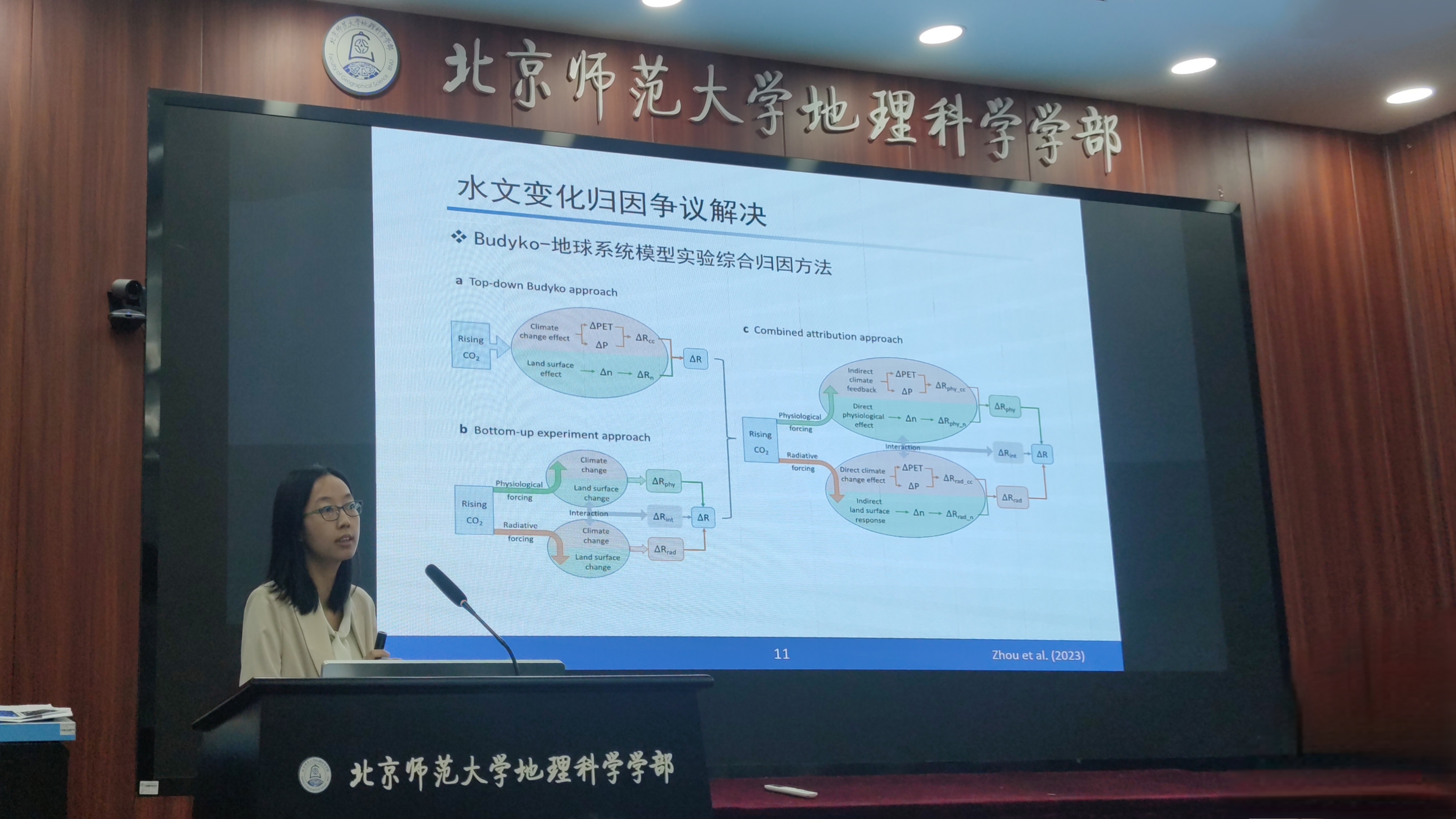 周沙研究员首先基于发表在Nature Climate Change的论文“Projected increase in global runoff dominated by land surface changes”(文章链接://www.nature.com/articles/s41558-023-01659-8)作题为“陆气过程对水循环的影响”的报告。周老师介绍此研究揭示了大气CO2浓度升高背景下陆-气过程影响全球径流变化的科学机制,发现陆面过程主导全球径流增加趋势,解决了基于Budyko假设的经验方法和基于地球系统模型的实验方法在全球径流变化归因方面的争议。随后,周沙老师分享了发表在Science Advances的论文“Global concurrent climate extremes exacerbated by anthropogenic climate change”(文章链接://www.science.org/doi/10.1126/sciadv.abo1638),作题为“全球同步极端气候时空特征和驱动机制”的学术报告。此研究构建了从格点到区域乃至全球尺度同步极端气候事件空间关联性统计方法,揭示了全球温度极端事件(极高温、极低温)和降水极端事件(极端降水、降水亏缺)的空间关联特征,采用最新CMIP6模型实验方法,量化了自然变率和人为气候变化对全球同步极端气候事件的影响。最后,周老师围绕“如何选择有意义的科学问题”“如何提升研究的意义”“如何提高论文写作能力”等方面分享了论文写作经验,鼓励大家在科学研究中把握大方向,做一个“长期主义者”。