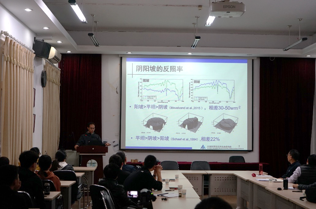 闻建光研究员作了题为“山地多角度遥感建模与反照率反演”的报告,就山地二向反射特性及反照率时空分布的特征、山地多角度遥感建模及反照率反演、山地二向反射与反照率遥感试验验证方法等问题进行了深入浅出的讲解。