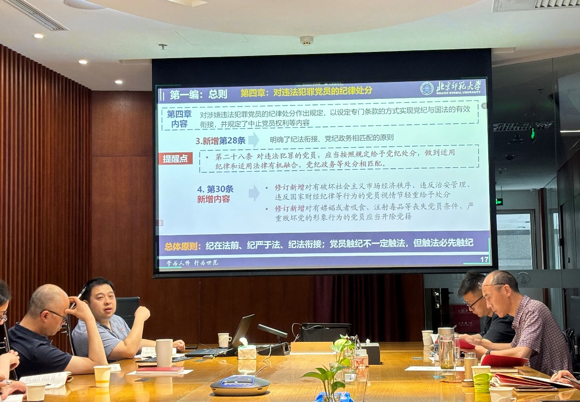 为深入学习新修订的《中国共产党纪律处分条例》(以下简称《条例》),准确把握其精神实质,不断增强党员干部政治意识、纪律意识、规矩意识,学部党委于5月14日下午在励耘学苑222会议室召开理论学习中心组(扩大)会议暨党纪学习教育专题读书班活动。会议特别邀请学校纪检监察机构办公室(纪委办公室)熊艺钧主任为与会人员逐条解读《中国共产党纪律处分条例》。学部党政班子成员、党委委员、教工党支部党员骨干及学部期刊编辑等20余人出席会议,会议由苏筠书记主持。