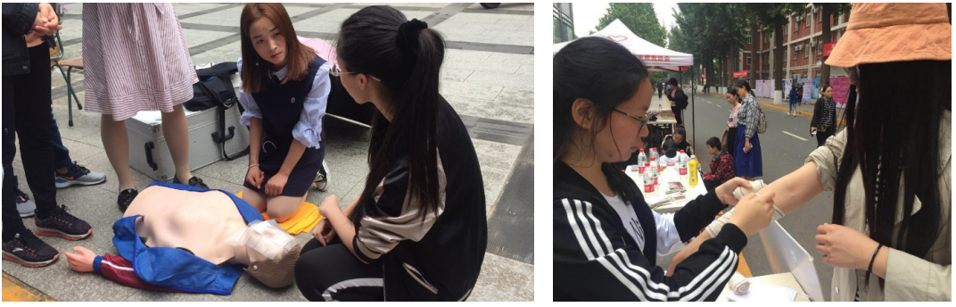 急救技能培训环节由我校红十字会承办,吸引了大批师生现场参与。红十字会的同学分别介绍了日常急救常识、创伤包扎、心肺复苏相关知识,实际操作并讲解了绑带包扎、螺旋包扎、八字形包扎、双肩包扎、头部包扎、心肺复苏和人工呼吸等。他们细致地将各种救护技能教给有兴趣学习的师生,耐心地讲解注意事项,大家纷纷感慨:“活动太有意义了,危急时刻这或许就能挽救生命!”。