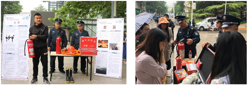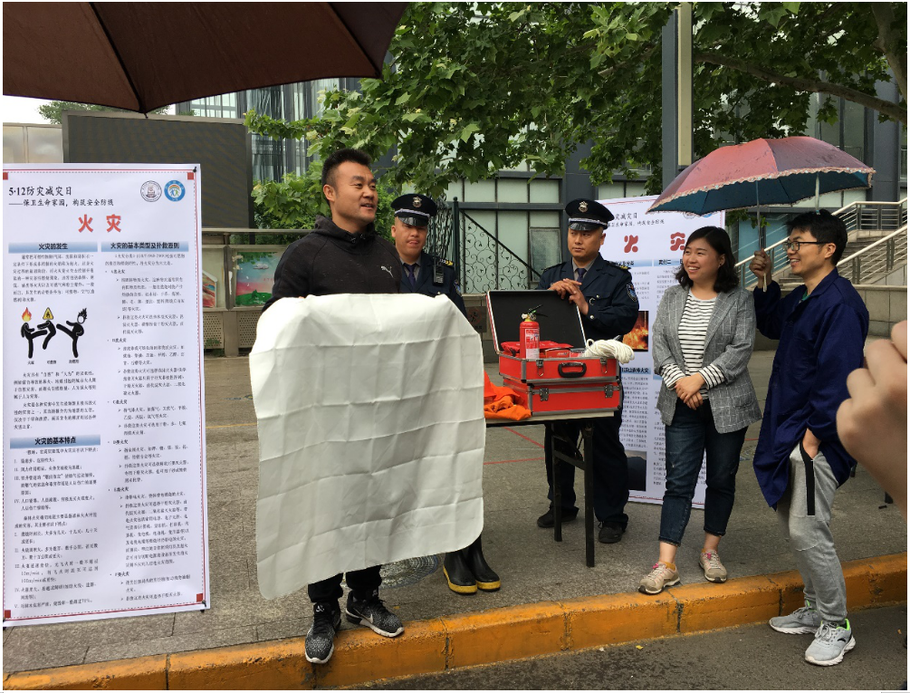灭火器演示教学环节邀请到我校保卫处吕刚老师与工作人员对灭火器、防火毯、急救箱、救生绳、防火面罩等一系列设备的使用方法和注意事项进行了专业细致的讲解,引来了多位师生围观学习。吕刚老师结合近期国家、高校出现的火灾事件,详细介绍了不同类型灭火器的使用、灭火急救箱内设备的使用、火场逃生的必备知识,强调了在灾难面前,生命是最可贵的,提醒广大师生防微杜渐、科学用电、逃生有方。虽然讲解期间下起了雨,但大家的热情丝毫没有被浇灭,纷纷踊跃提问,保卫处的工作人员也冒雨进行了耐心、细致的讲解。