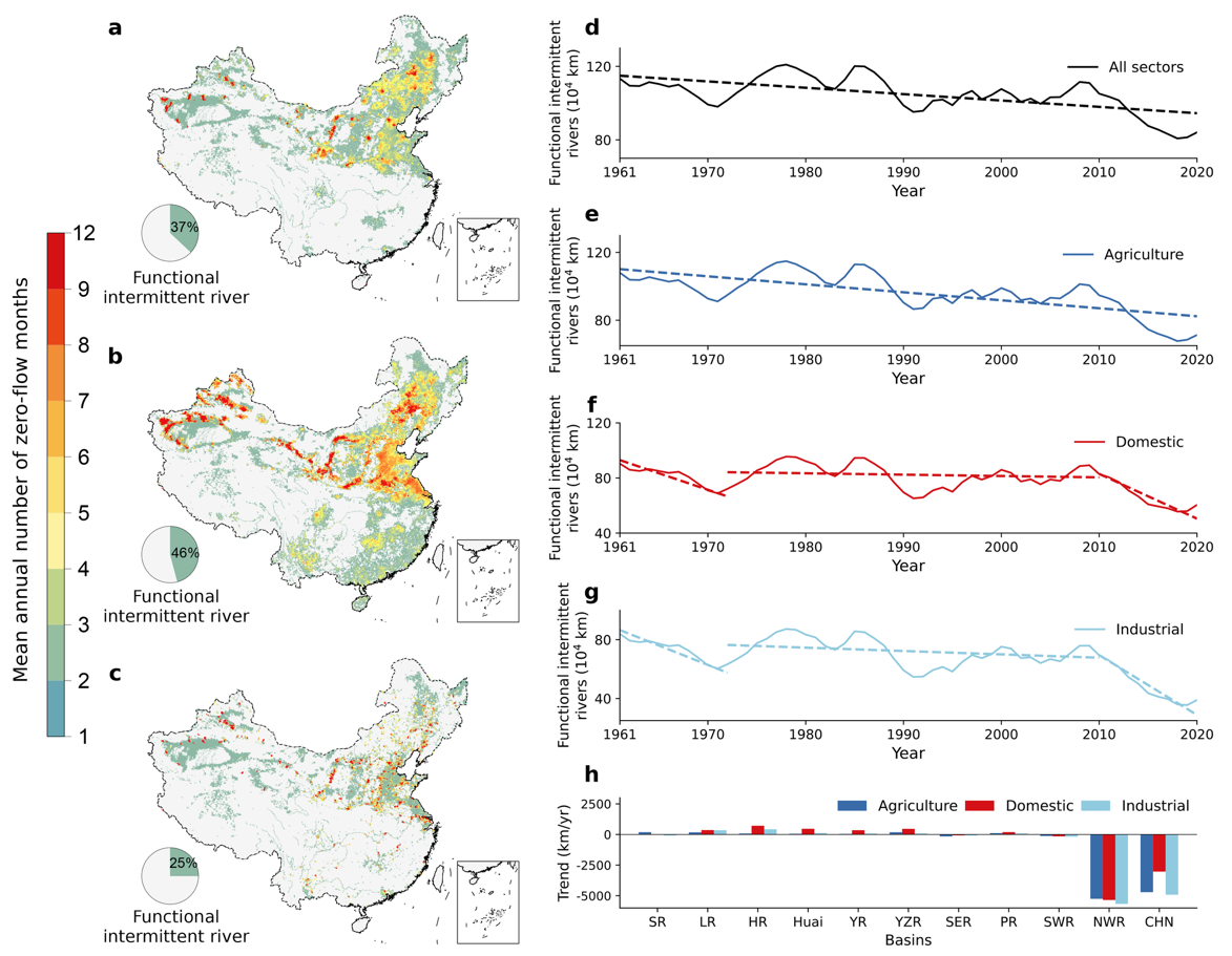 此外,本研究不再仅凭自然流量来评价河流间歇性,转而采用一种综合性框架,将农业、生活与工业取水及环境流量需求纳入考量。结果表明,以此标准衡量的“功能性断流”比例较传统评估结果显著攀升,深刻揭示了人类用水对河流水资源的巨大消耗压力。其中,农业用水部门的河流功能连通性影响最为严重(图2)。在我国北方地区,尤其是华北平原和东北平原,表现出较为严重的河流功能连通性丧失,而南方地区具有更高的河流承载力,以支持社会经济、环境和水生态系统可持续稳定发展(图2a–c)。全国尺度上,考虑多部门取水的功能间歇性河流长度呈显著递减趋势,平均下降率为−3461 km/yr(图2d)。在流域尺度上,除西北诸河外,大多数流域的功能性断流长度较其自然断流长度均显著增加。其中,海河、辽河与淮河流域的增长尤为显著(图2h)。