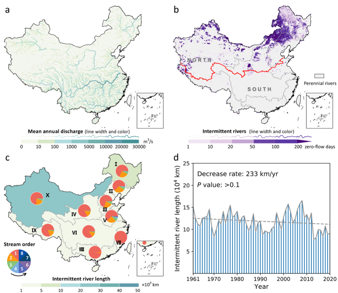 研究发现,1961–2020年期间约有31905条河流被识别为间歇性河流,河流长度范围为0.06至108.14 km,长度约占我国所有河流总长度的13%,中国北部和南部地区之间存在极大差异(分别为13 %和1 %,图1b)。在十大流域中,东南诸河的间歇性河流长度最短(120 km),而西北诸河的间歇性河流长度最长(约2.2×105 km)(图1c)。此外,河流流量间歇性通常出现在低阶河流中,并且随着河道级别的增加而减弱(图1c)。这也进一步凸显重建全覆盖流量资料的必要性,观测水文站大多布设在常年性河流,应用站点观测资料评估河流水文连通性可能导致非系统性误差。尽管我国过去60年河流间歇性呈不显著下降趋势,但气温升高通过减少地表可用水量部分抵消了该下降趋势,当去除长期温度趋势时,其下降趋势进一步增加了一倍。同时,去除降水长期趋势的模拟试验也证实了气温增加对流连通性的负向影响作用,未来需要持续关注暖干化气候区河流水文连通性。