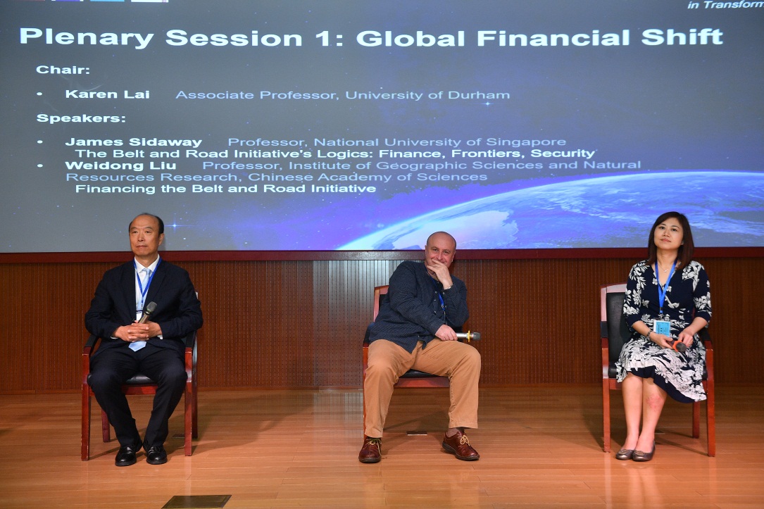 第一场主题报告由杜伦大学副教授Karen Lai主持,主题是全球金融转移。新加坡国立大学地理系教授James Sideway、中国科学院地理科学与自然资源研究所经济地理学教授刘卫东分别作了主题报告。