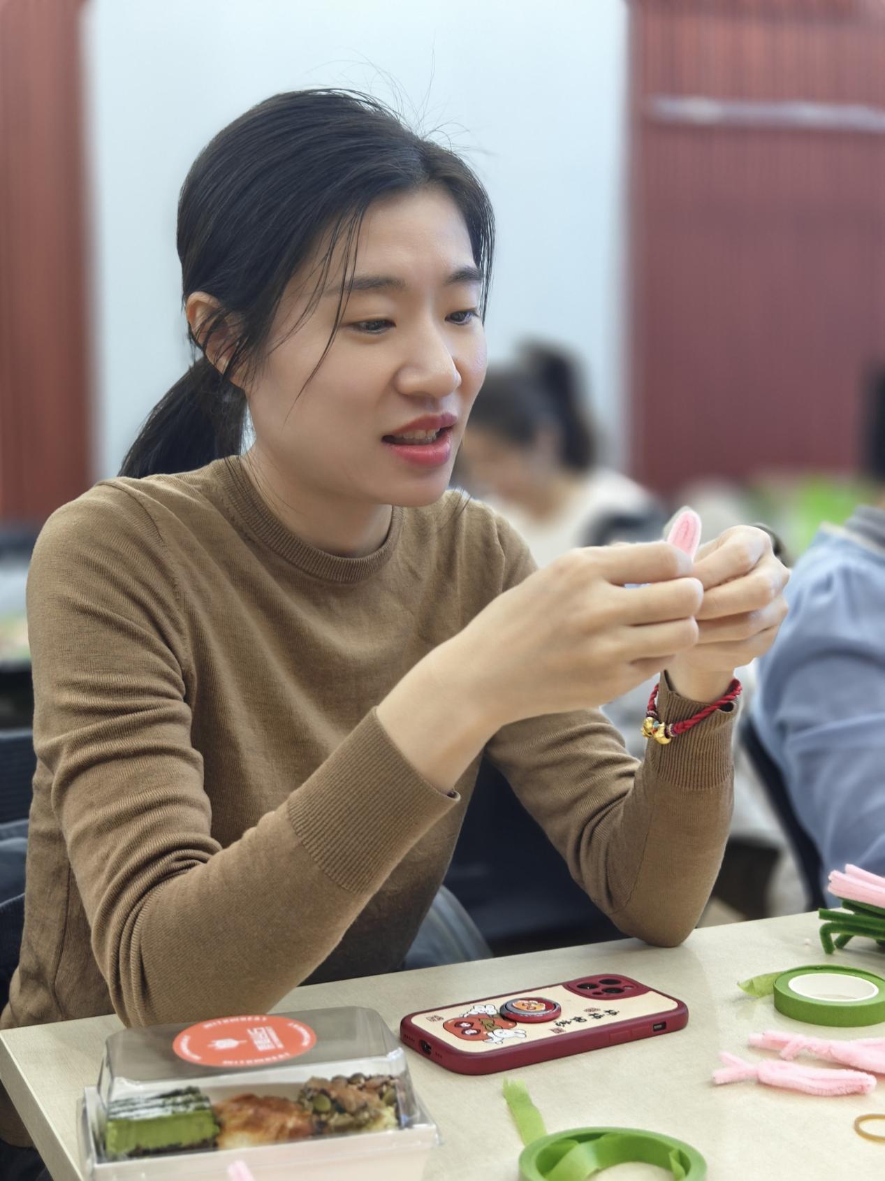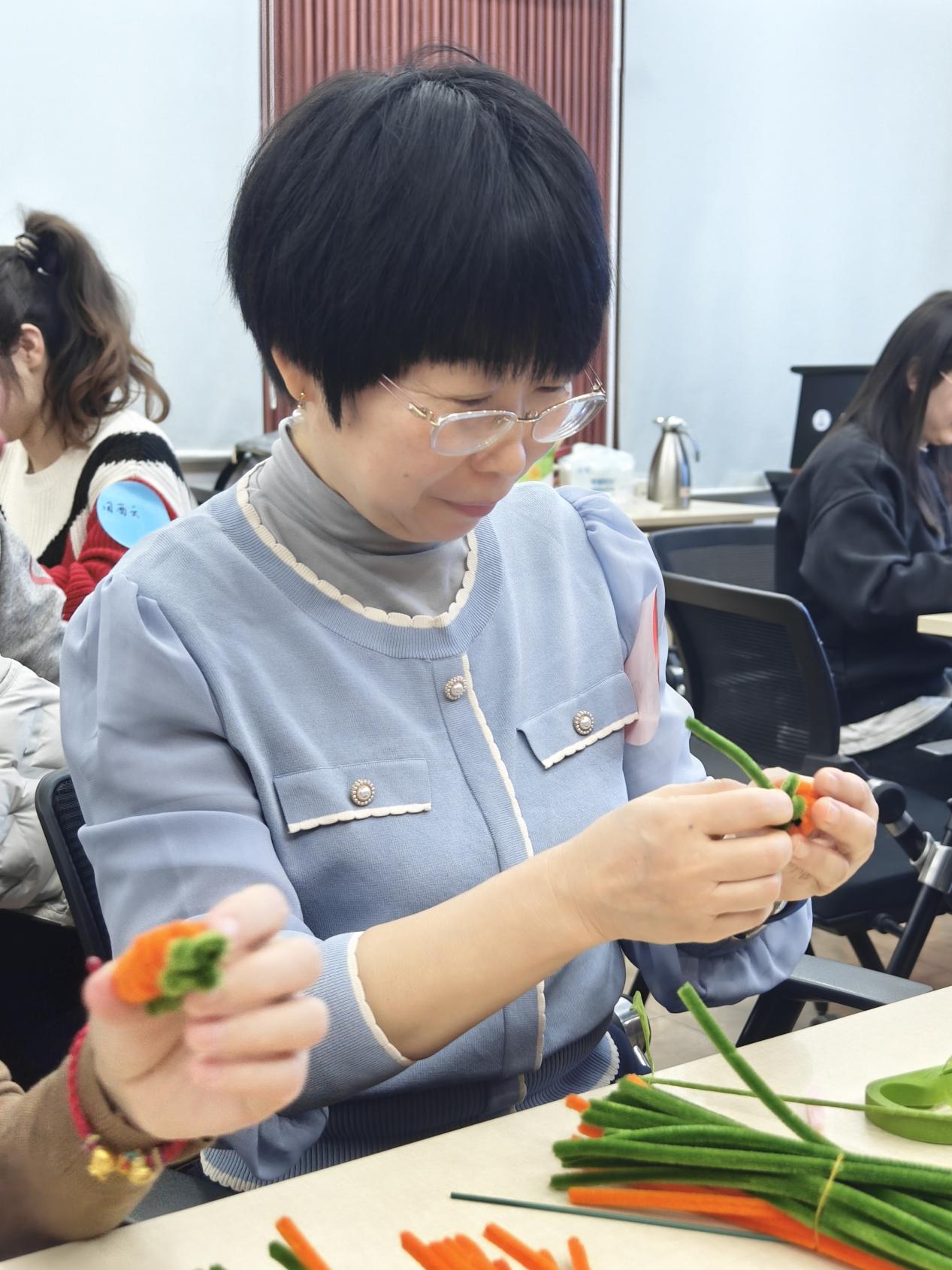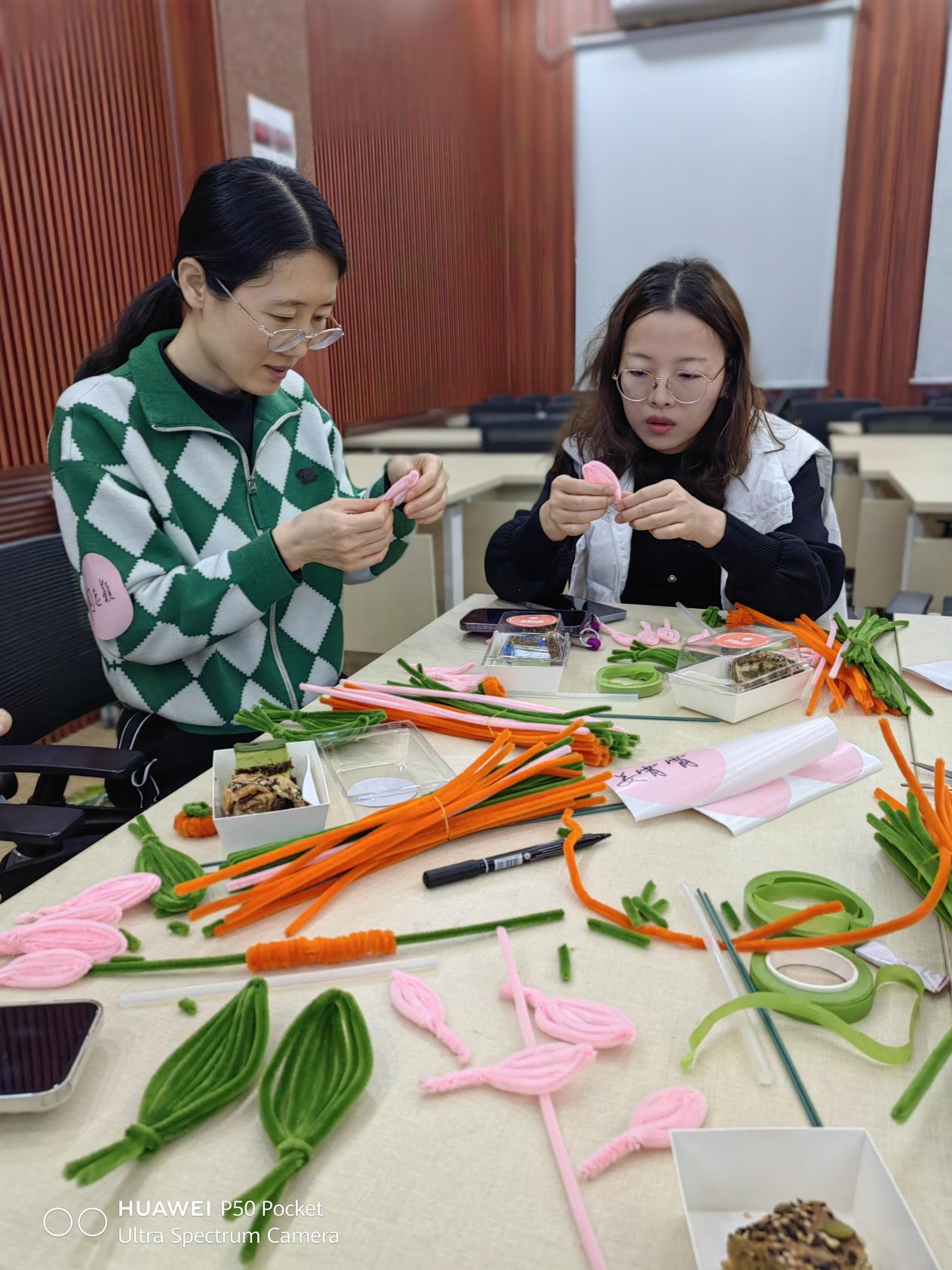 来自学部7个工会小组共计40余位工会会员参加了此次活动。活动由行政陆发数据中心工会小组长金璐老师主持,学部综合办公室副主任杨逸姗老师统筹组织,财务办李煦冬老师现场教学,带领大家用扭扭棒制作成美丽的郁金香花朵和象征收获的小柿子。老师们认真学习,热烈讨论,各自发掘出多种新颖造型,活动现场温馨热闹。