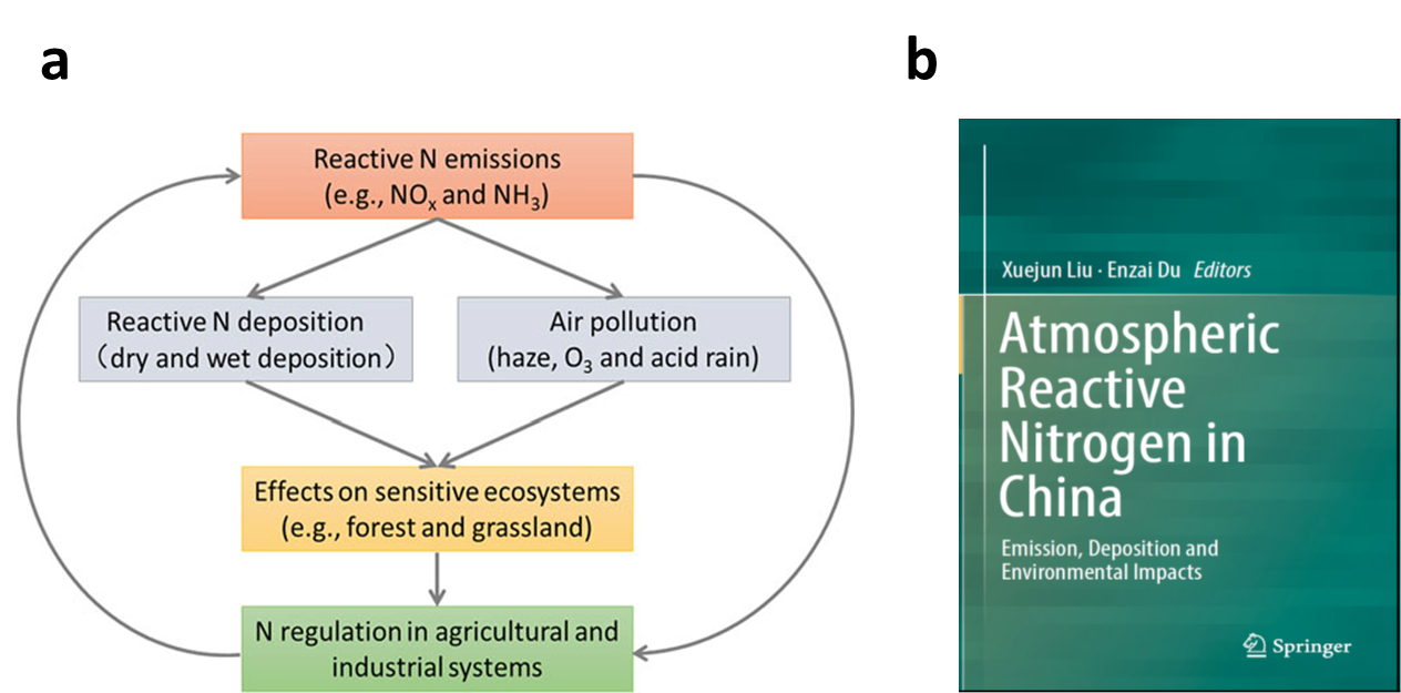 工业革命以来,人类工农业活动和城市化过程向大气中排放了大量活性氮气体(如NOx和NH3),其在大气圈、生物圈和水圈不断迁移和转化,深刻改变了全球氮循环过程,并引发了一系列环境生态效应,受到广泛关注。中国是当前全球活性氮排放和沉降的热点区域,近年来我国学者的相关研究显著提升了关于大气活性氮排放、沉降及其环境生态效应的认识,然而尚缺乏系统性的梳理和总结。杜恩在副教授受Springer出版社邀请与中国农业大学刘学军教授共同组织国内相关领域的知名学者,分别从中国大气活性氮的排放与沉降格局、大气活性氮对中国大气污染的贡献、大气氮沉降对敏感生态系统的影响、活性氮排放的管理等四个方面(图1a)分别撰写了14个章节的评估报告,近期以 《Atmospheric Reactive Nitrogen in China: Emission, Deposition and Environmental Impacts》(图1b)为题在线出版。作为对中国大气活性氮现状及其环境效应的首次系统性评估,本书对国内外相关领域的研究生、学者及环境管理者有重要的参考借鉴意义。
