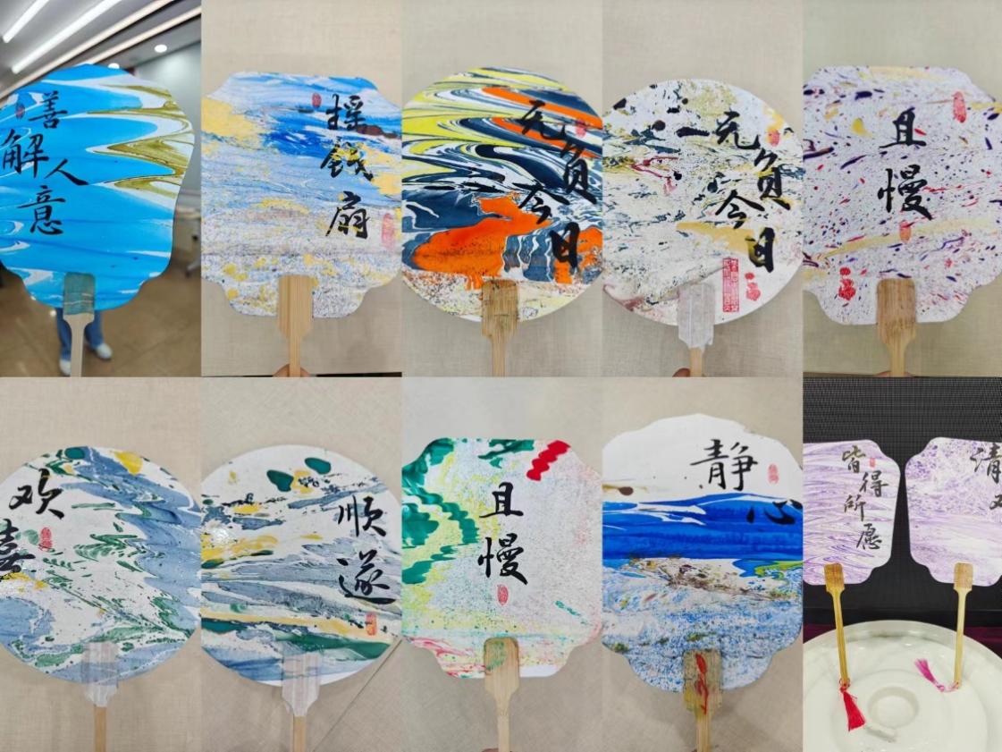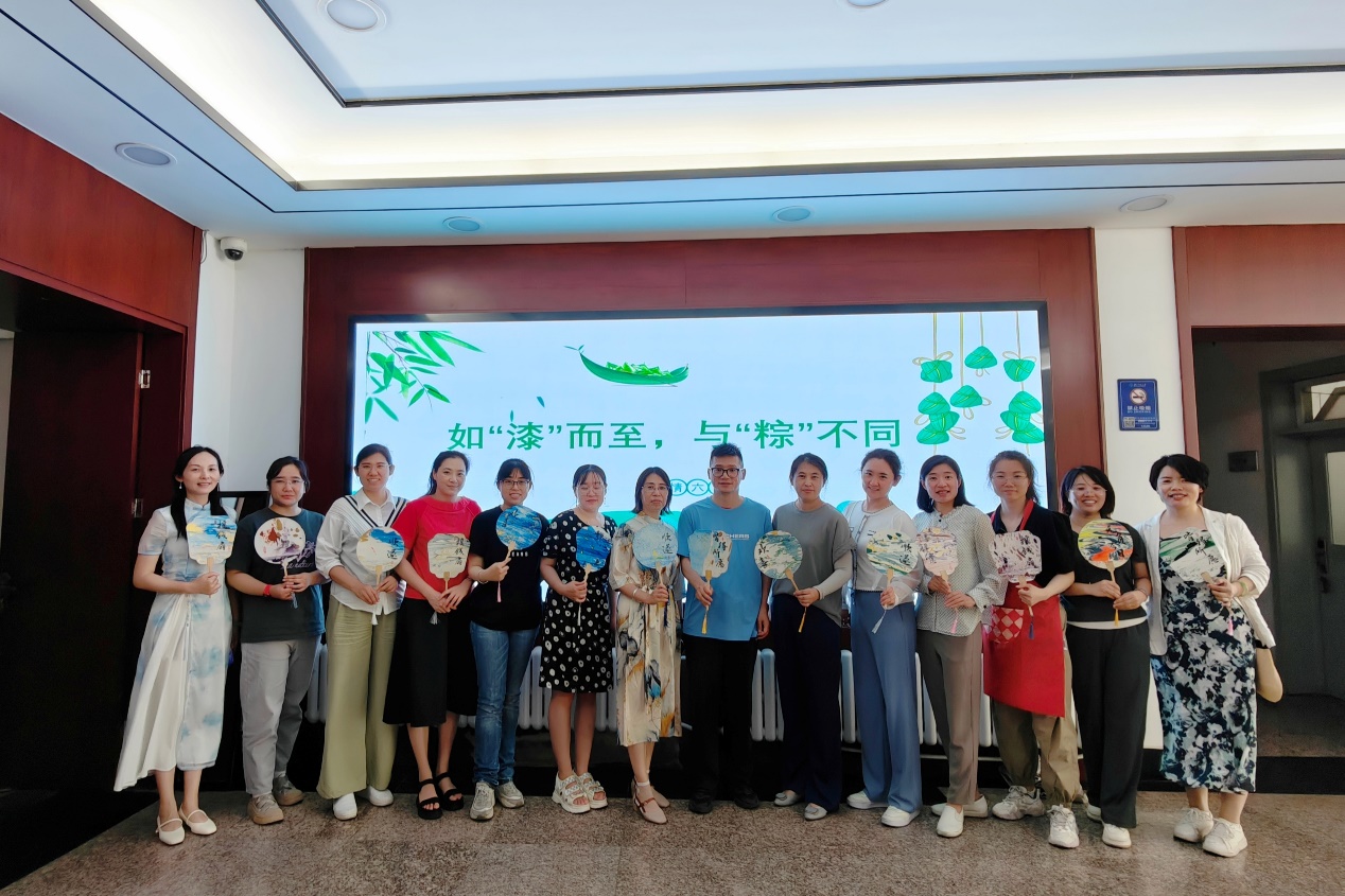 本次活动包括签到、发材料、活动介绍、“漆画扇”制作、欢乐合影等环节。活动前,筹备小组通过问卷收集了参会老师的信息,查找了漆画扇相关资料及制作方法,并为老师们准备了手工材料。活动中,工会主席杨华老师回顾了去年的端午节活动及今年活动的延续,介绍了漆画扇的历史和制作方法。在活动高潮“漆画扇“制作环节,老师们6人一组,亲手制作属于自己独一无二的漆画扇。活动现场张张笑脸、欢乐和欣喜声、专心致志的神态,无不洋溢着老师们的幸福感。最后每一件独特又精美的漆画扇作品,成为了端午节最好的礼物。