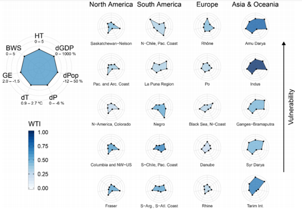 图2 各大洲前5位水塔单元的脆弱性和预测的变化。较大的多边形表示总脆弱性。BWS是流域基线水胁迫;GE是流域政府效率;HT是跨境水冲突;dGDP和dPop是根据共享社会经济路径预测的2000年到2050年国内生产总值和人口的变化;dP和dT是根据RCP4.5的CMIP5多模型集成平均值预测的2000年至2050年间的降水和温度变化。彩色填充表示水塔指数