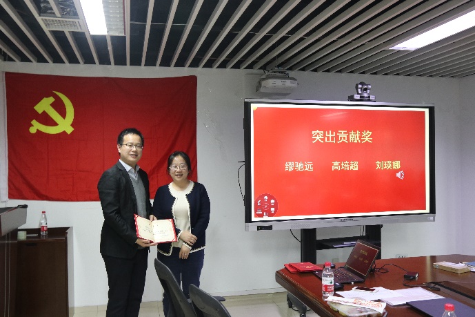 苏筠书记和杨晓峰处长分别为获奖同志颁奖并进行总结发言,苏筠书记肯定了支部在过去一年中所取得的系列积极进展,勉励支部所有成员在新的一年中奋发进取、再创佳绩。杨晓峰处长强调将一线基层的优秀技术人员吸纳到党的队伍中的重要性,这将不仅为党支部注入了新鲜的血液,进一步扩大了党支部的党员队伍,也鼓舞新老党员在以后的生活中积极进取,不忘初心,不断完善自己,为各项工作的推进作出更好的贡献。