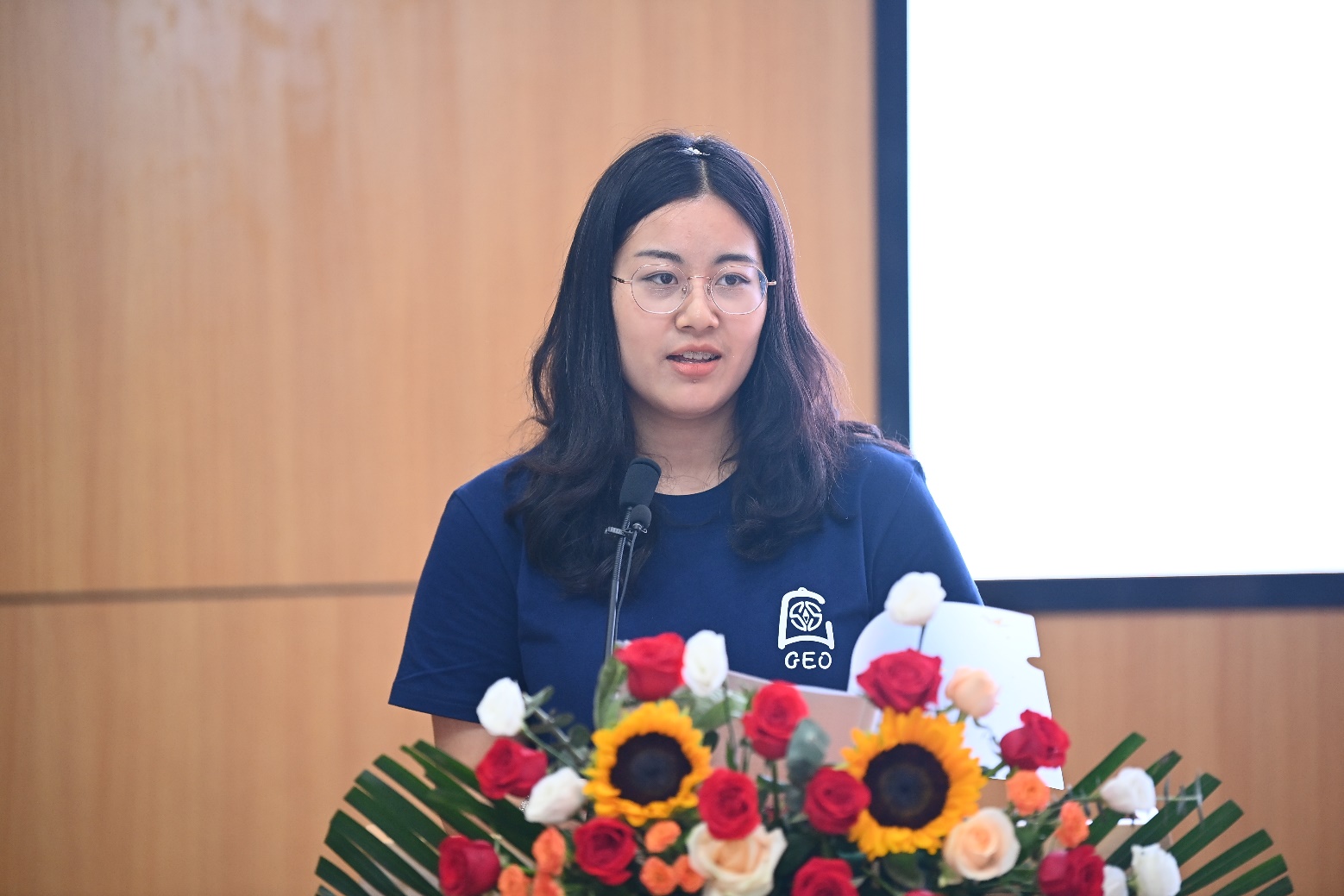 刘美含同学代表研究生新生发言。她回顾本科经历,深感地理学魅力,因实力与热爱与北师大双向奔赴。如今站在新起点,她表示将适应研究者身份,积极投身科研,为生物多样性保护和应对气候变化贡献力量,以实际行动践行地理人的担当与使命。