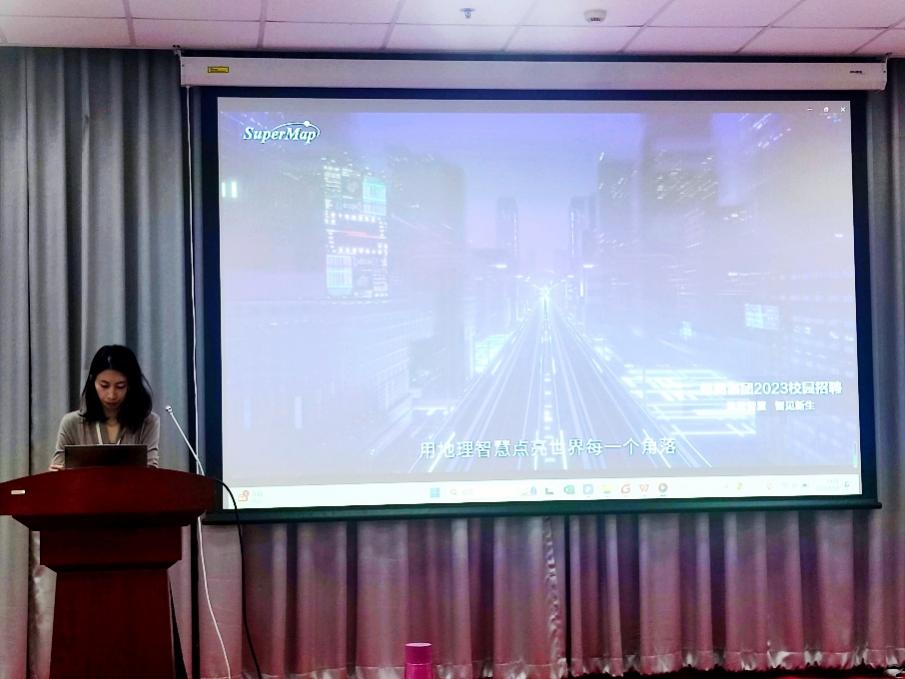 最后,集团企划中心教育生态部运营总监王璐向同学们分享了超图走进高校的教育情怀,介绍了第21届SuperMap杯高校GIS大赛和即将举办的GIS技术大会,并鼓励同学们积极参与到地理信息行业的建设中去,和超图一起推广和普及地理信息技术。她鼓励大家像超图的方言一样“行远而不凡之路,做难而正确之事”,先跑起来再调整呼吸,先飞起来再张开翅膀。
