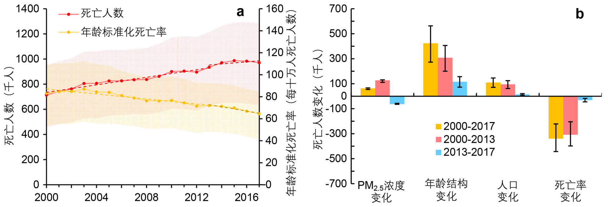 图1 中国实施“大气十条”对PM2.5污染致死人数的影响。(a)2000-2017年PM2.5污染致死人数和对应的年龄标准化死亡率的时间动态。(b)各个因素对于PM2.5污染致死人数变化的贡献。