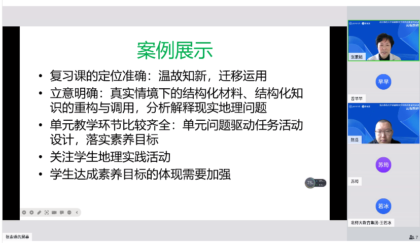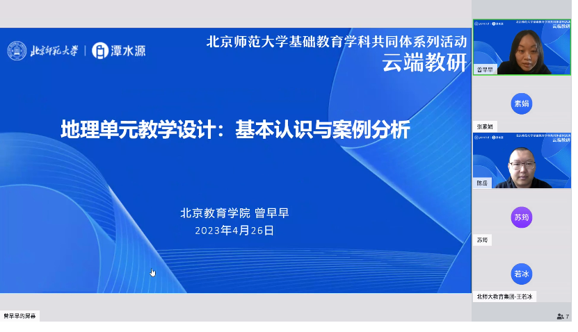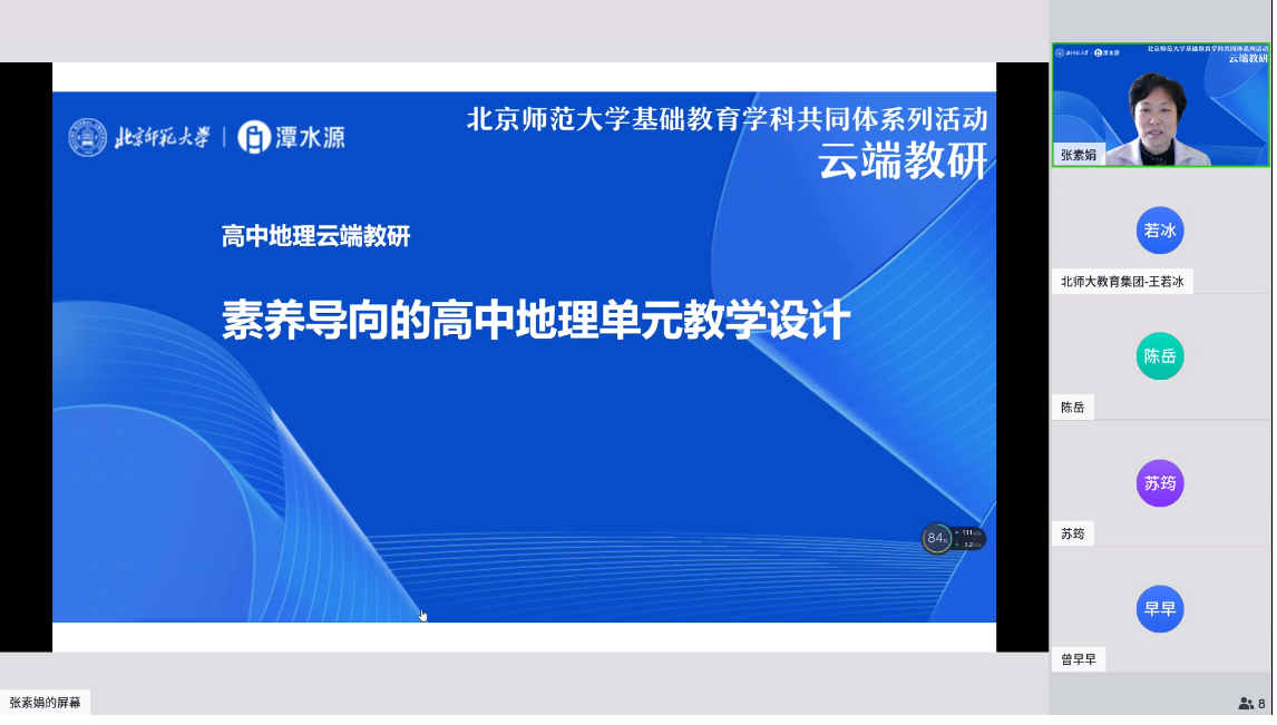 2023年4月26日上午,北师大基础教育地理学科共同体系列活动“云端教研”活动成功举办。本次教研活动的主题为“素养导向的高中地理单元教学设计—大单元教学设计案例展示与点评”,共有176名北师大附校的教师们通过云端相连,教研共享。