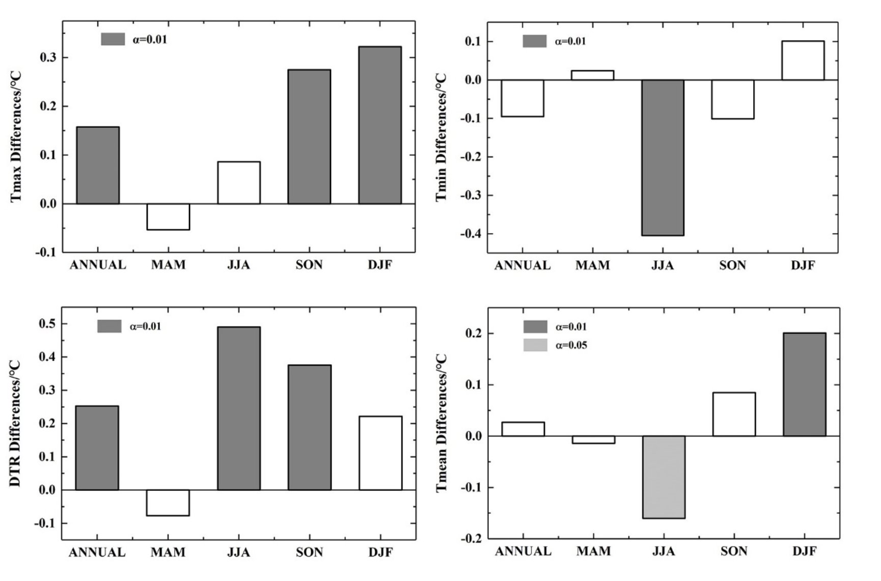 图2 2009-2011年和2013-2015年年平均(ANNUAL、)春季(MAM)、夏季(JJA)、秋季(SON)和冬季(DJF)兰州站和榆中站各类气温差的变化(2013-2015年减去2009-2011年)