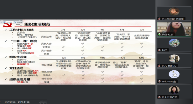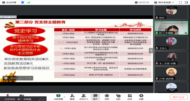 党建小组办公室、组织部、二级党校、宣传部和信息部分别进行年度的工作汇报,总结过去一年的工作及不足。
