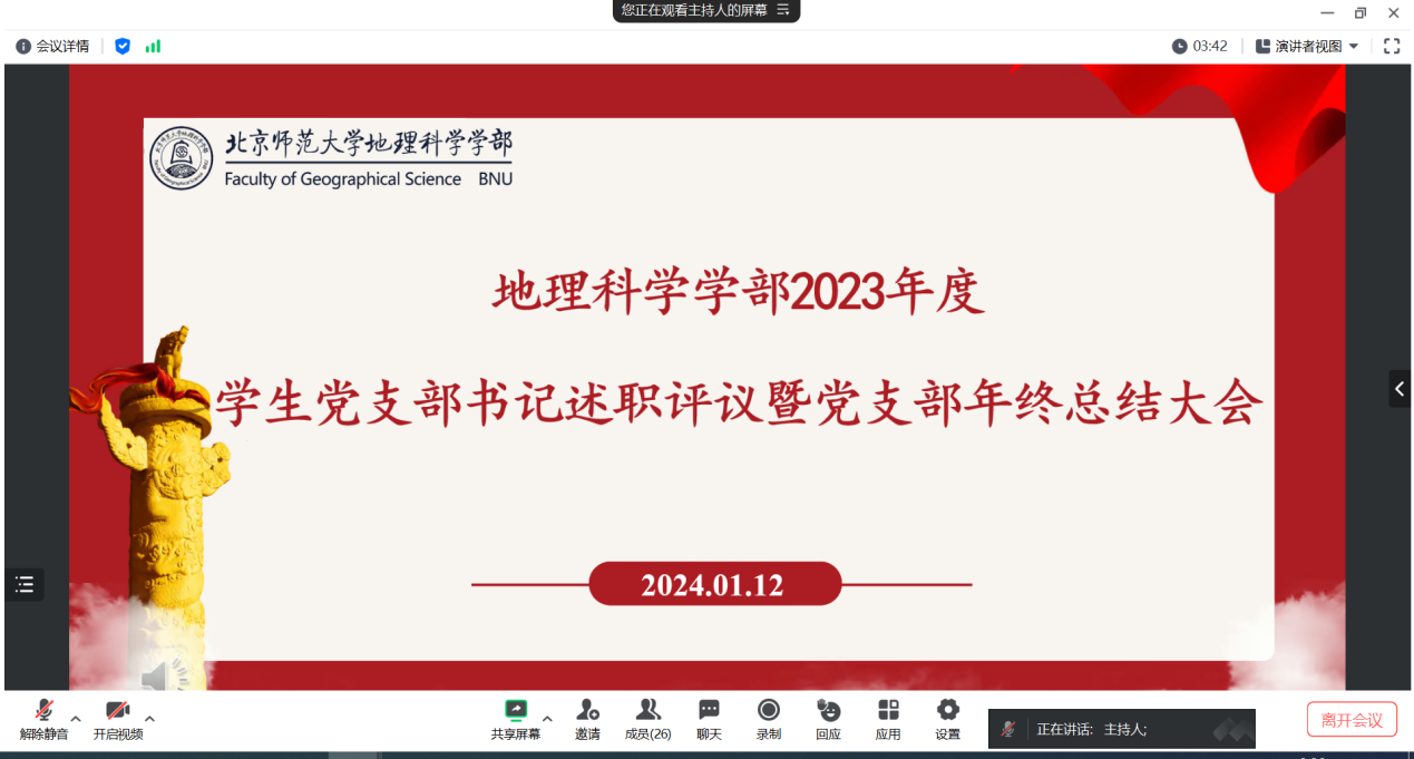 为深入学习贯彻习近平新时代中国特色社会主义思想,强化基层党支部党建工作,2024年1月12日上午,老司机论坛 党委于线上组织召开了2023年度学生党支部书记述职评议暨党支部年终总结大会,莅临本次会议的评委老师有老司机论坛 党委副书记张红老师和老司机论坛 党团学工办公室曹潇元老师,全体学生党支部书记等出席会议,会议由党建小组李昭茜主持。