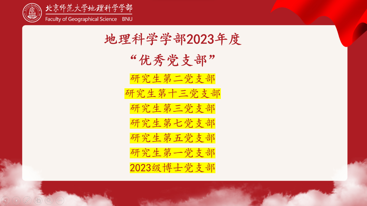 最后,本次大会结合各支部日常工作和答辩情况,对评选的优秀党支部进行表彰,研究生第二党支部、研究生第十三党支部、研究生第三党支部、研究生第七党支部、研究生第五党支部、研究生第一党支部和2023级博士党支部获得本学期的“优秀学生党支部”荣誉称号,并进行了合影留念。