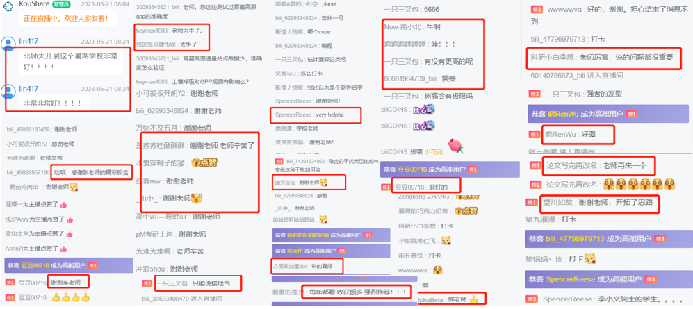 课程通过B站、蔻享、科研圈内人微信直播三个平台同步全网直播,受到全球各相关领域的学者、学生及技术人员的广泛关注,取得了巨大的反响和良好的评价。课程在B站“知识直播-科学科普”专区位居榜首,获关注6954人,累计收看18672人次,获点赞10594人次;蔻享直播观看11595人次;科研圈内人微信直播观看13256人次。三个直播平台学习累计43523人次。