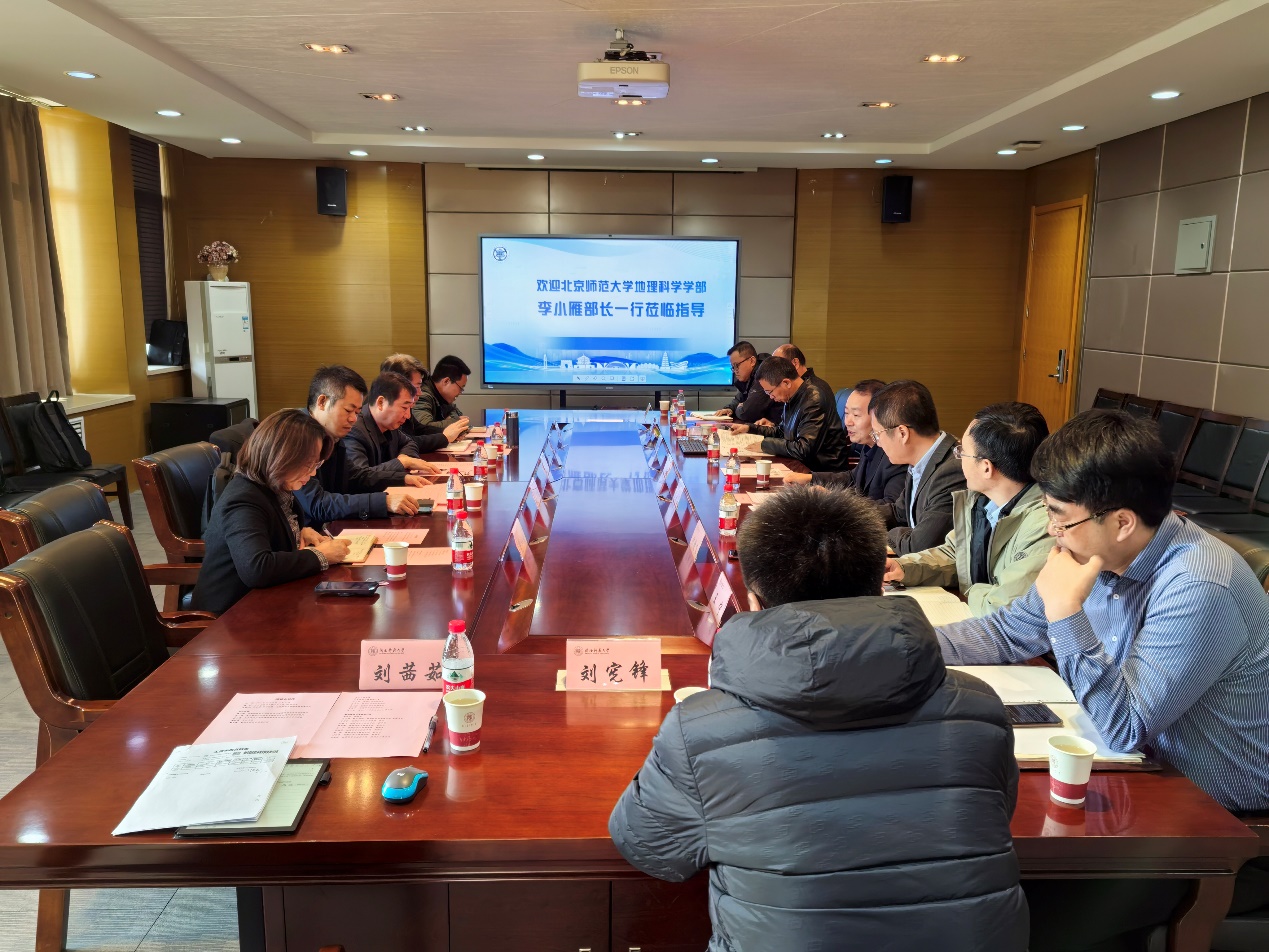 王云博书记主持会议,对李小雁部长一行的到来表示热烈欢迎。李君轶院长介绍了地理科学与旅游学院的基本情况、人才培养概况、科学研究进展及目前存在的问题,针对人才队伍培养、野外台站建设、重大项目培育等方面列举了学院下一步工作举措,希望在多方面得到北师大地理学部的支持。