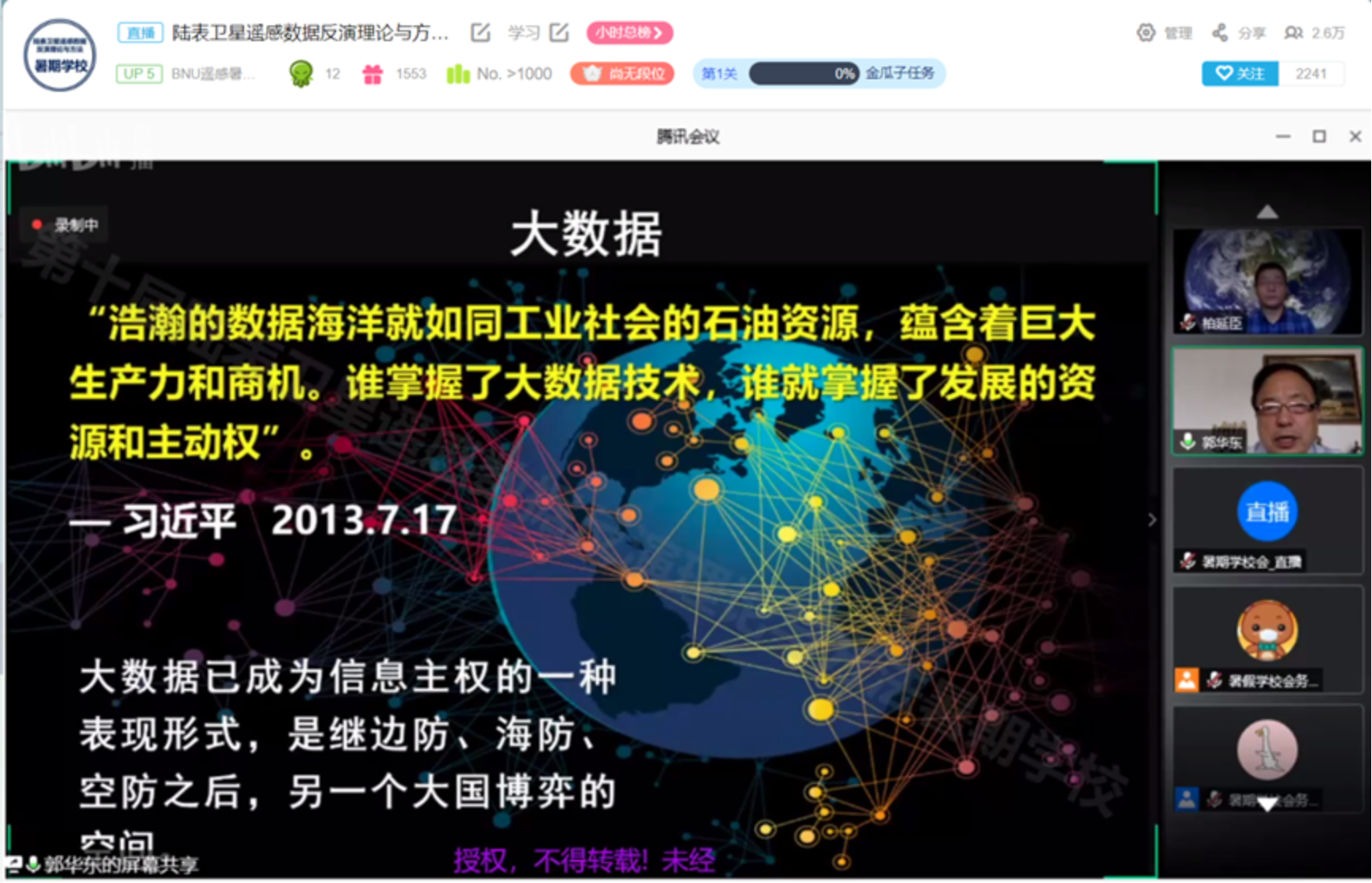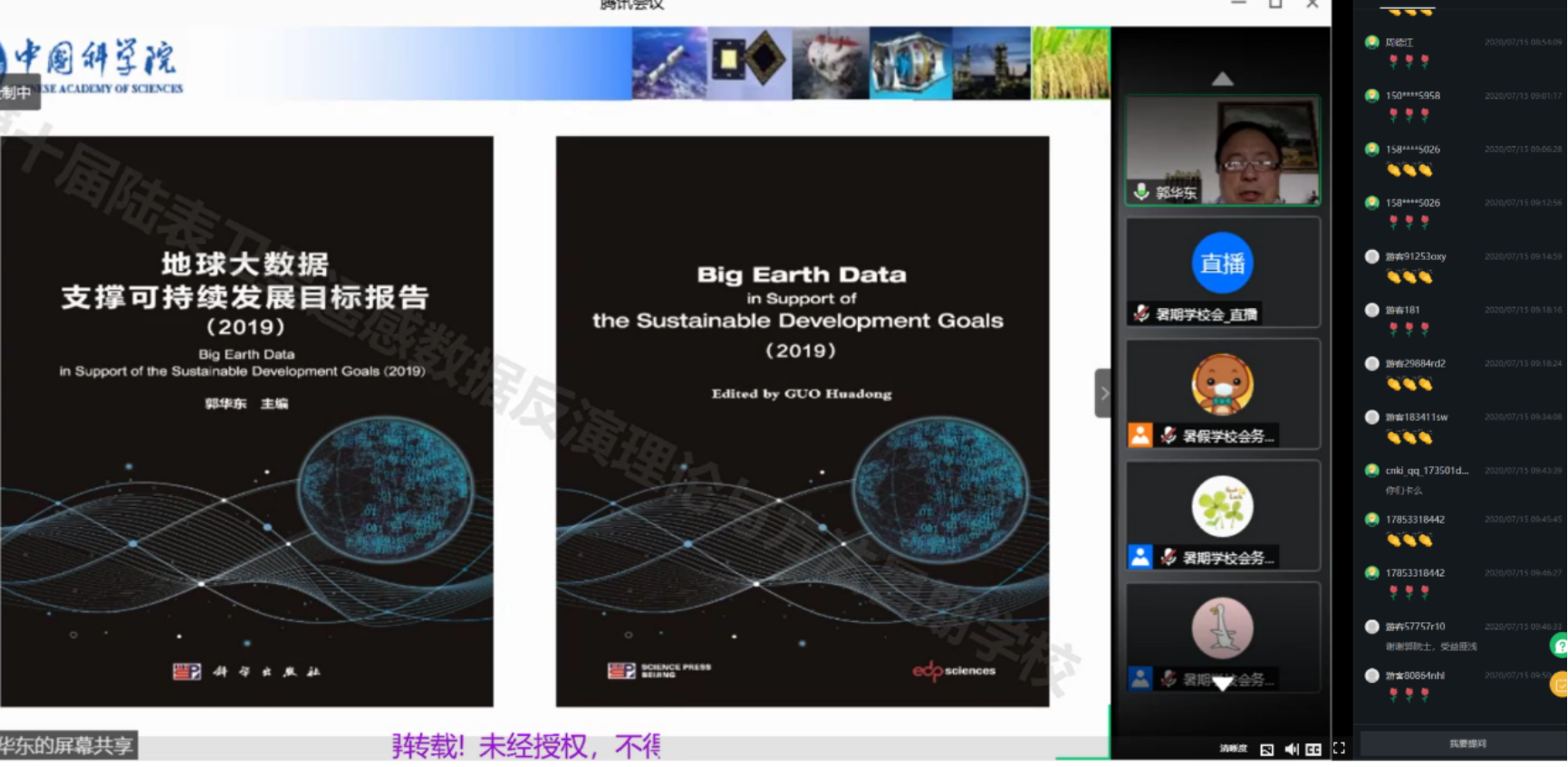 2020年7月15日,著名地球科学学家、中国科学院院士、发展中国家科学院(TWAS)院士、国际欧亚科学院院士、中国科学院A类战略性先导科技专项“地球大数据科学工程”首席科学家郭华东研究员应邀出席第十届陆表卫星遥感数据反演理论与方法暑期学校(在线)开学典礼,并为4500余名学员作了题为“地球大数据支撑可持续发展目标“的特邀报告。老司机论坛 执行部长宋长青教授出席了报告会。