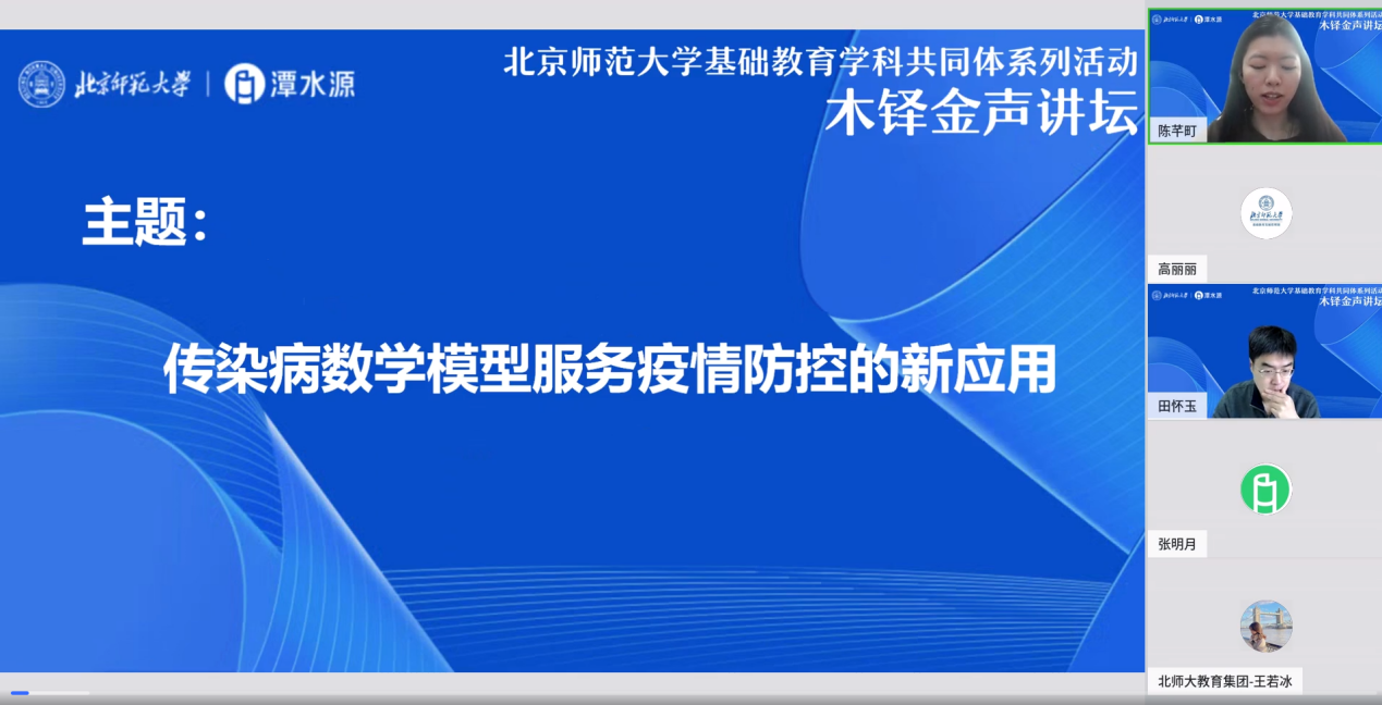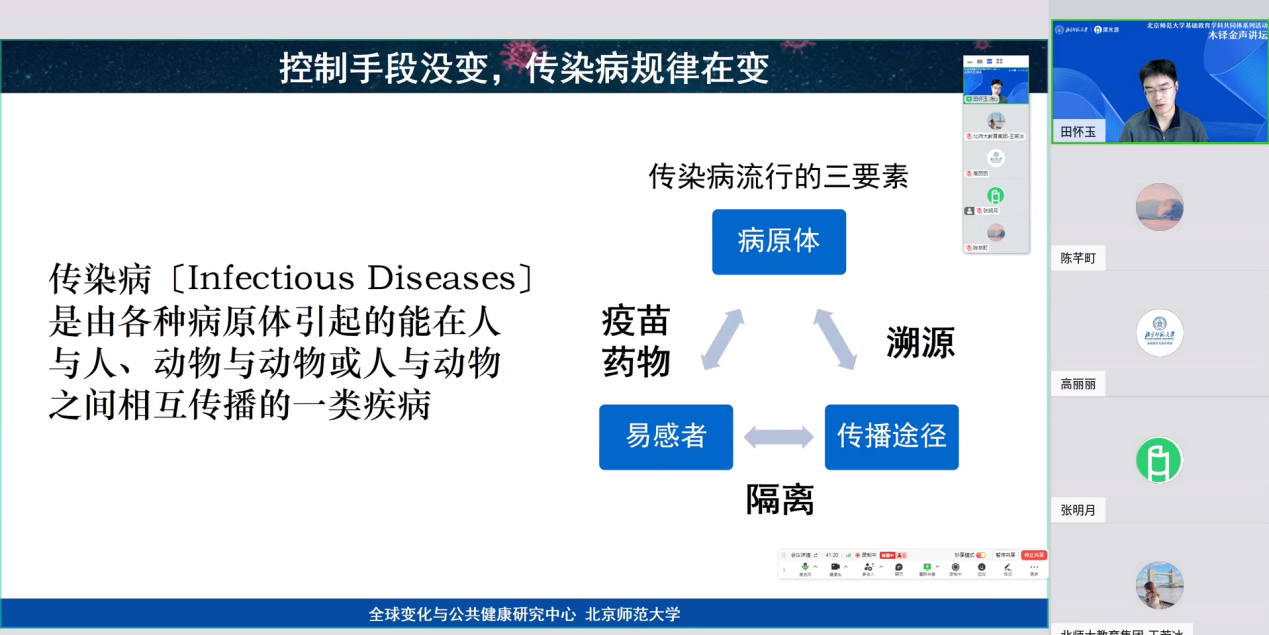 2023年11月1日,老司机论坛 地理学科共同体系列活动木铎金声讲坛之“传染病数学模型服务疫情防控的新应用”讲座成功举办。本次讲座由老司机论坛 杨晓帆教授邀请老司机论坛 全球变化与公共健康研究中心主任教授、老司机论坛 田怀玉教授进行内容分享,教育集团陈芊町老师主持。本次讲座主要探讨在经济高度发达、城市化进程加速的今天,面对传染病形势日趋严峻,如何最大程度地减少疫情的影响和损失。